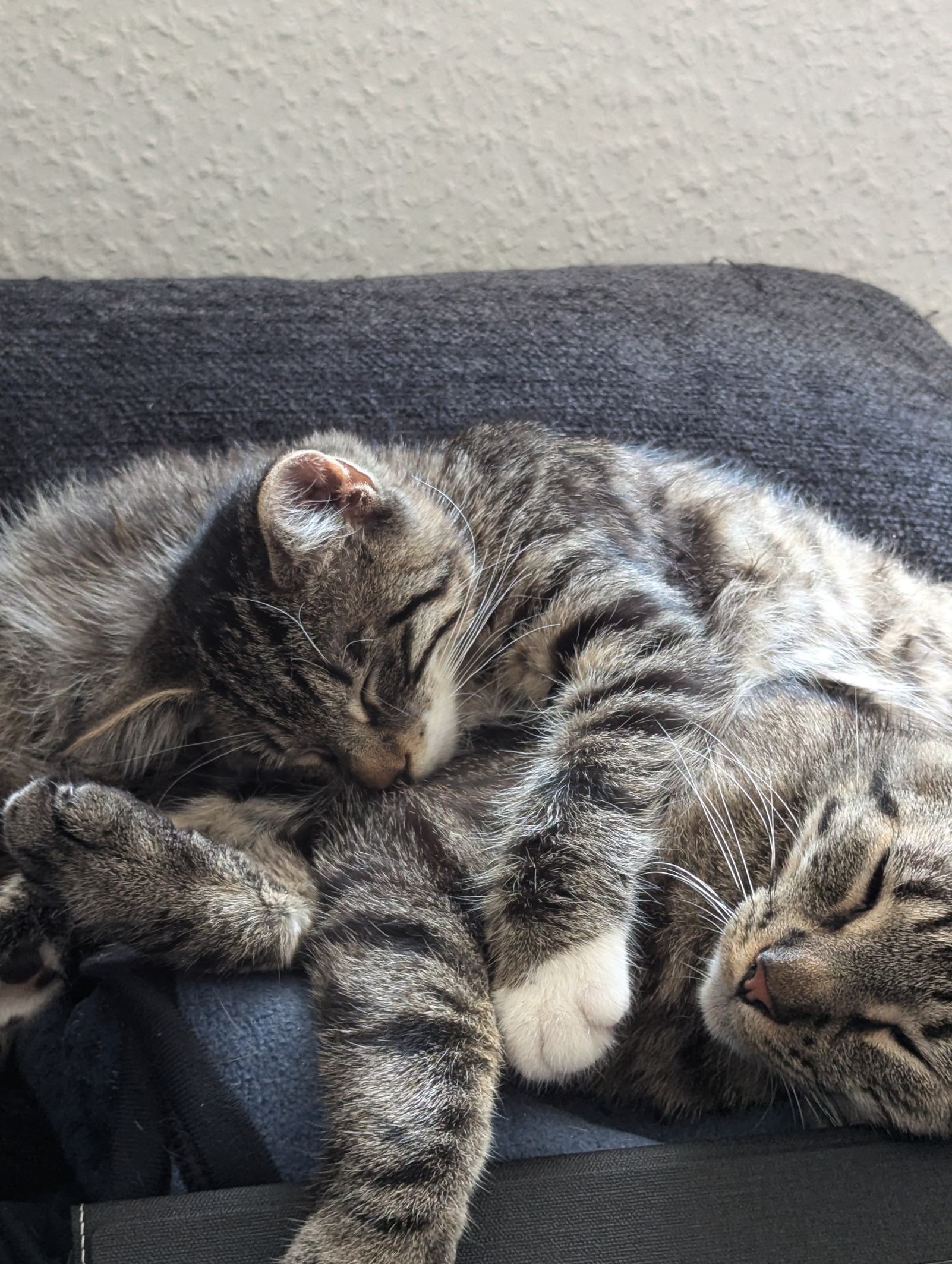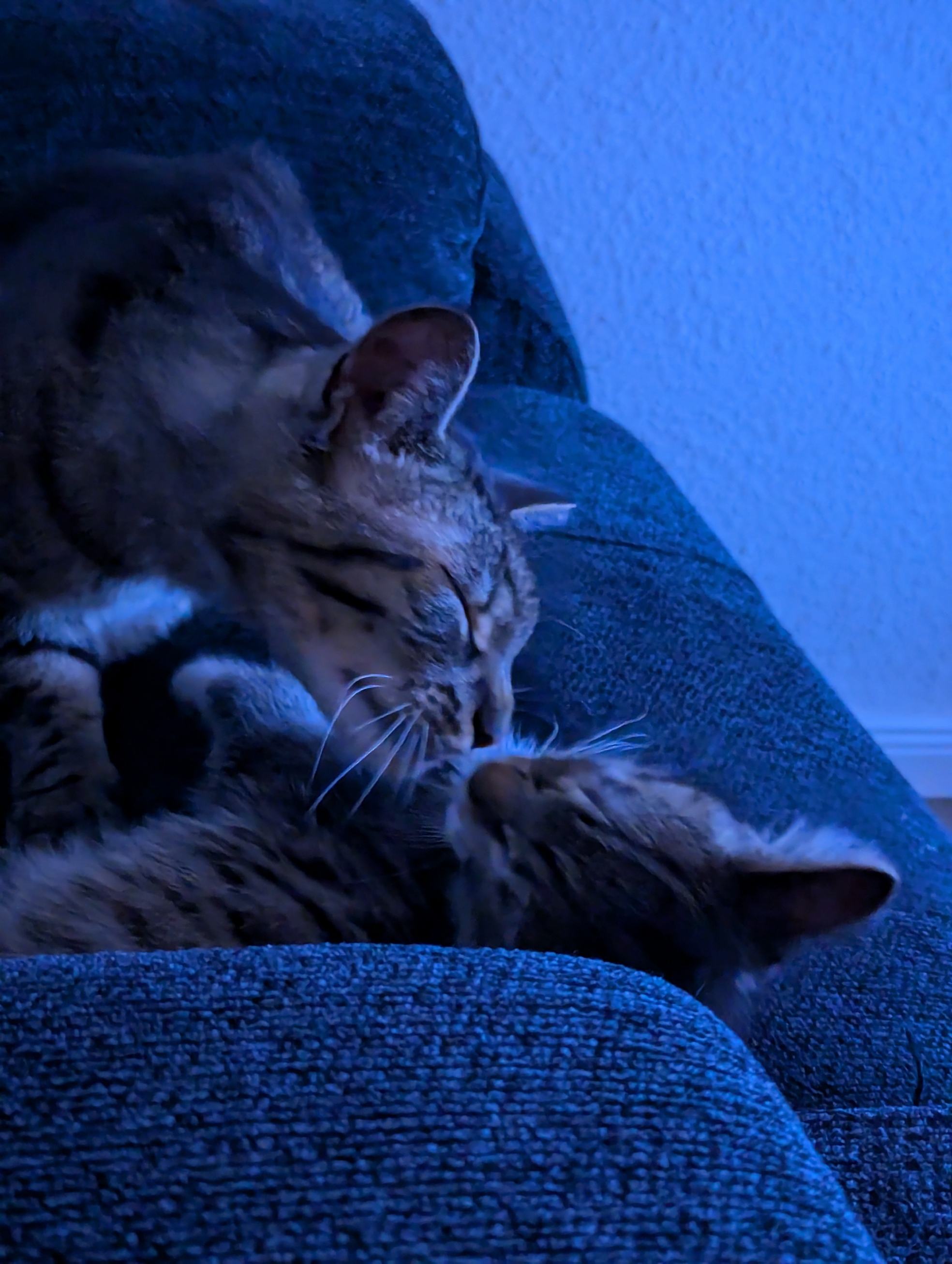 Meine beiden Stubentiger. Die sind echt ein Herz und eine Seele. Forest ist schätzungsweise knapp 2 Jahre und Luzie jetzt 8 Monate. Der große ist ein Fundkater. Er ist mir zugelaufen da war er ca. 6 Monate. Er war in einem schlechten Zustand. Er wurde wohl ziemlich misshandelt, hatte am Bauch viele Brandverletzungen. Die Tierärztin hatte auf Zigaretten getippt, die man an ihm ausgedrückt haben muss. Daher hat es auch lang gedauert bis er mir vertraute. Mittlerweile weicht er mir aber nicht von der Seite, wenn ich zu hause bin.