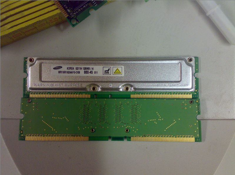 Der "eigenartige" RAM wie du es bezeichnest, sollte RD-RAM aka RIMM aka Rambus In-Line Memory Module sein. Intel hatte mal vor das als Nachfolger vom SD-RAM durchzusetzen, hat jedoch nicht so ganz geklappt. AFAIK wurde RD-RAM unter anderem beim P4 eingesetzt, bevor es die ersten DDR-RAM- bzw DualChannel-DDR-Chipsätze gab war der RD-RAm der einzige mit dem man den P4 wirklich hinterm Ofen hervor locken konnte. RD-RAM hatte schon zu den damaligen Zeiten effektive Taktraten von bis zu 1066MHz soweit Ich mich erinner, aber dafür eine sehr schmale Speicheranbindung. Die Module waren sauteuer und man musste sog. Terminatormodule in die Speicherslots setzen damit man auf eine gerade Anzahl von Modulen kam. Korregiert mich wenn Ich falsch liege :)