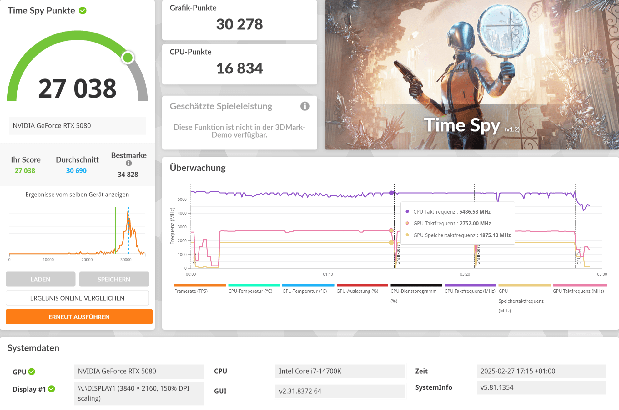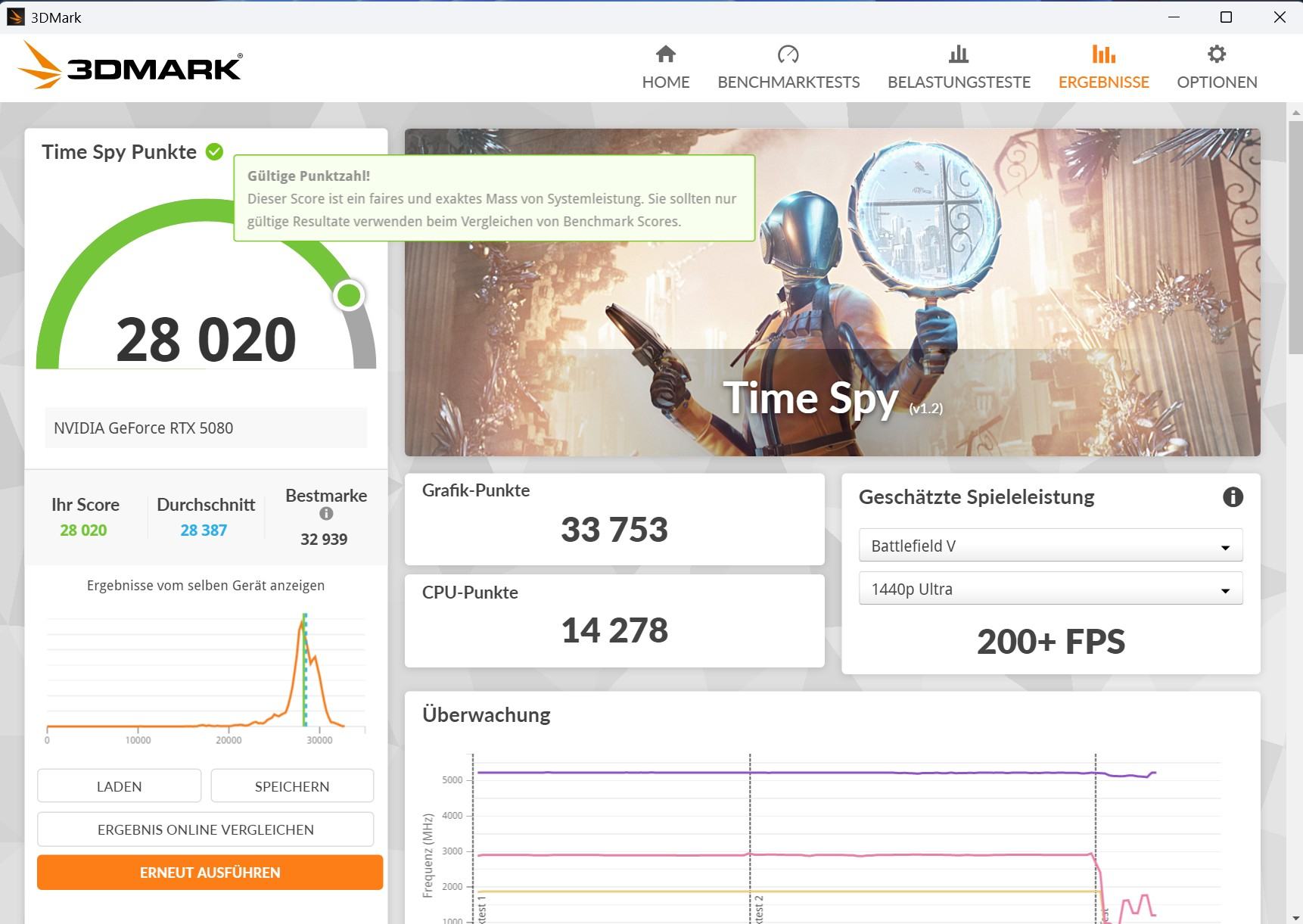 3.3 3D-Mark Time Spy v1.2, der alte, kostenlose Benchmark, nicht der Extreme: 30278 Punkte