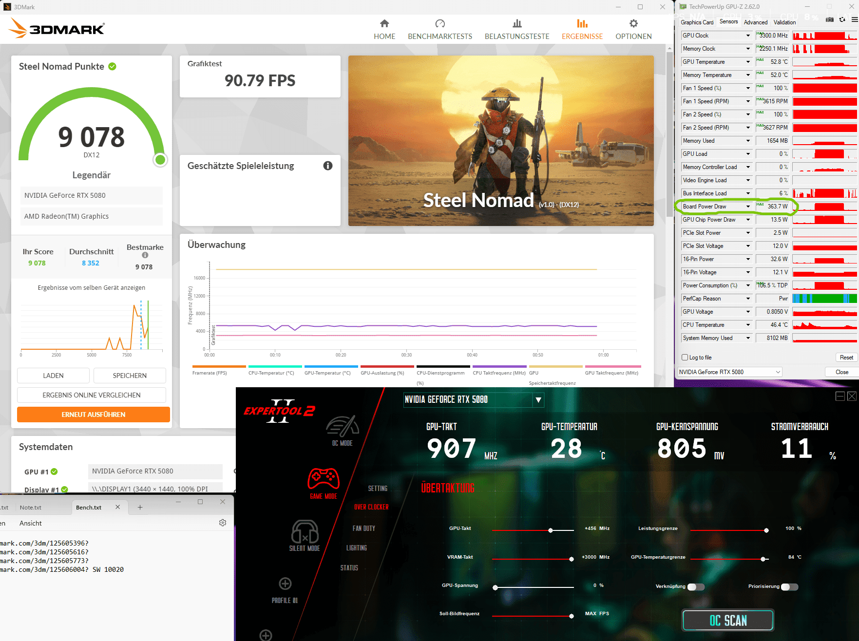 Ich teste weiter, dann auch und vor allem mit gesenkten Powerlimits. Das Powerlimit zu erhöhen macht keinen Sinn, da man Gefahr läuft die Kabel und die Buchsen zu schmelzen. Die 360W der 5080 praktisch schon an der Schmerzgrenze, lieber wären glatte 300W gewesen, dann hätte man Leistungsreserven von 100%.