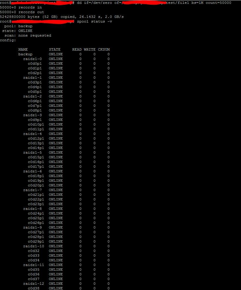 es gab einen Pool X mit 2 Raidz1 vdevs(je 5 Platten). Durch div. Spielereien mit dem "Power Management" habe ich es geschafft diesen Pool zu zerstören. Zpool status meldete 3 Platten sind nicht verfügbar ... was aber nicht weiter schlimm ist, zumal das ganze auf einem Testsystem passierte.