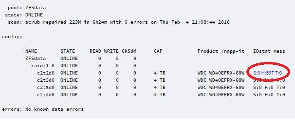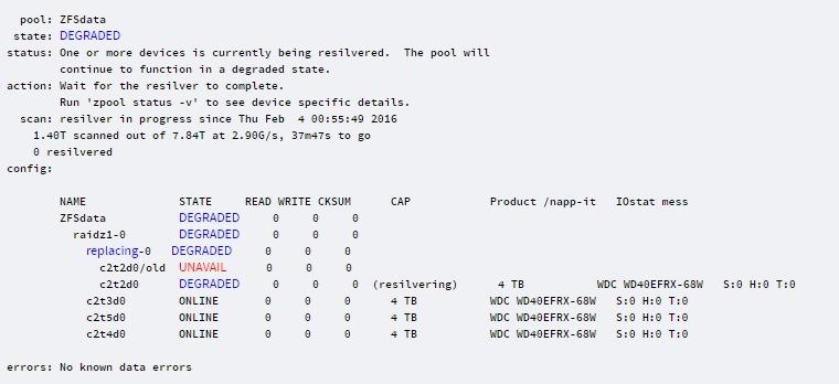 c2t2d0 ZFSdata raidz1-0 DEGRADED S:3 H:0 T:0 WDC WD40EFRX-68WT0N0 sat,12 PASSED 37 °C WDWCC4E0XRY96D -- short long abort log