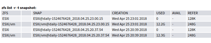 D.h. ich müsste im PRE Skript die entsprechenden VMs runterfahren und im POST Skript dann wieder starten. Eigentlich müsste dann ja gar kein ESXI Snap von diesen VMs gemacht werden, dem im heruntergefahrenen Zustand, sollte der ZFS Snap ja konsistent sein, oder?