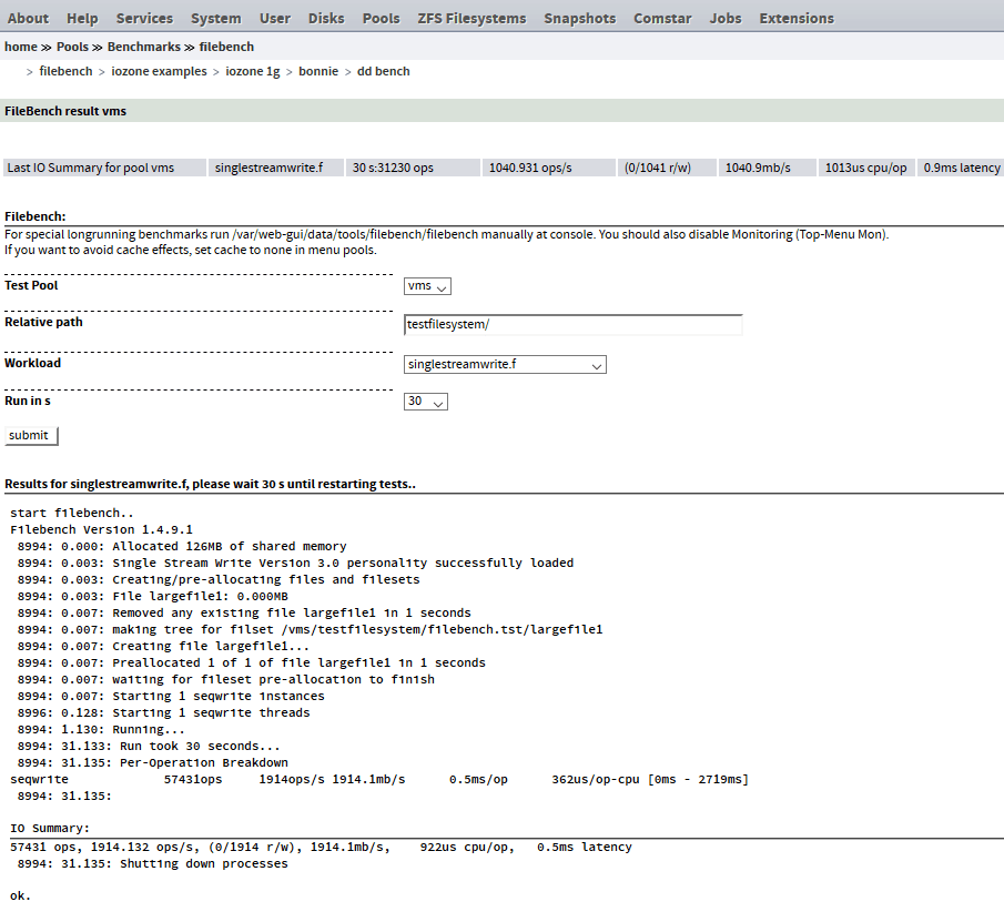 For special longrunning benchmarks run /var/web-gui/data/tools/filebench/filebench manually at console.