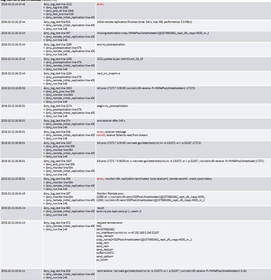 Die zfs receive Fehlermeldung "failed to read from stream" ist leider nicht besonders aufschlussreich. Das kann beideuten dass gar keine Daten empfangen werden, diese korrupt sind oder ein sonstiges Problem besteht.