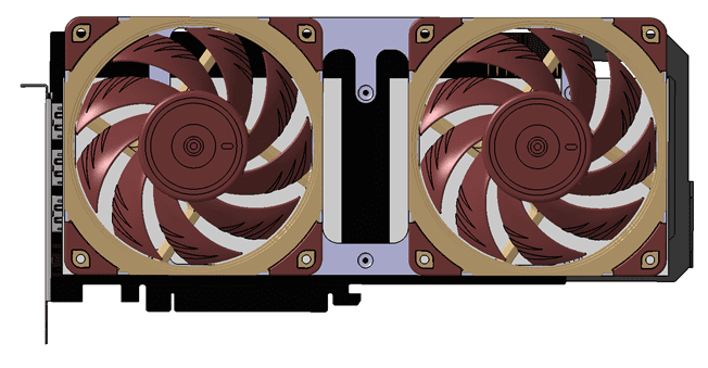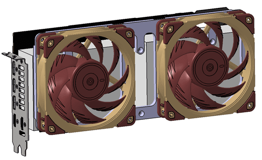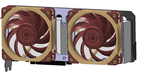 Diese Lösung setzt auf 2x120er Lüfter und eignet sich auch für kompaktere Gehäuse, da die Kartenlänge unverändert bleibt. Einzig in der Breite (also zur Seitenwand) legt sie etwas zu.