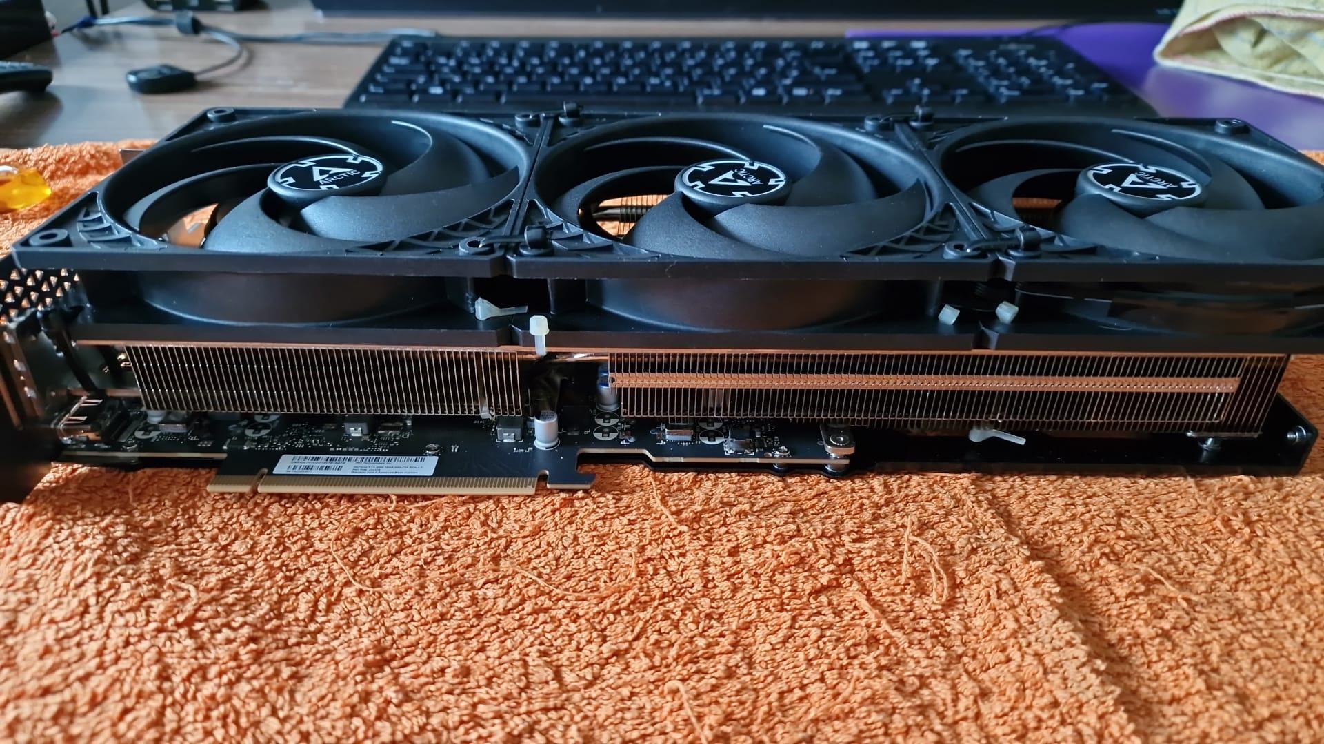 Lautstärke und Temperaturen können sich definitiv sehen lassen. Rund 6-8°C kühler + um Welten leiser. Selbst auf 1.000rpm (angelegt von der GPU) sind die T30 so viel leiser und angenehmer, echt ein Traum. Nicht nur, dass GPU und VRAM jetzt kühler laufen, auch SSDs und Chipsatz profitieren von der besseren Belüftung. Dank der T30-Lüfter gibt die GPU deutlich weniger Wärme an Mainboard bzw. Mainboard-Heatsink ab. Bin auf jeden Fall ziemlich happy mit dem Umbau.