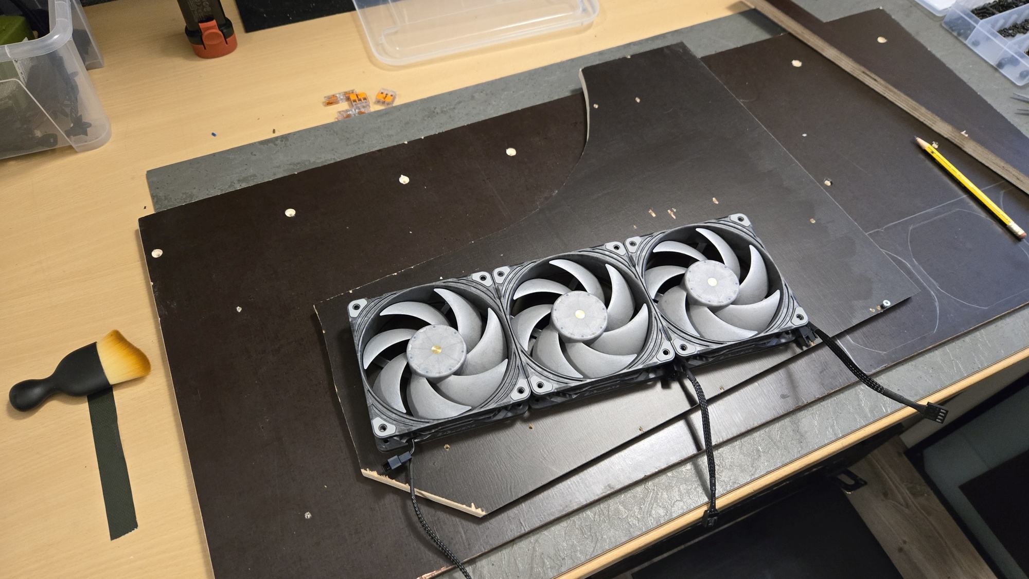 Das Befestigen der Platte hätte man dann mit längeren Schrauben (vom Notebook-Zubehör) problemlos bewerkstelligen können und die Lüfter einfach mit Holzschrauben in die Platte fixieren.