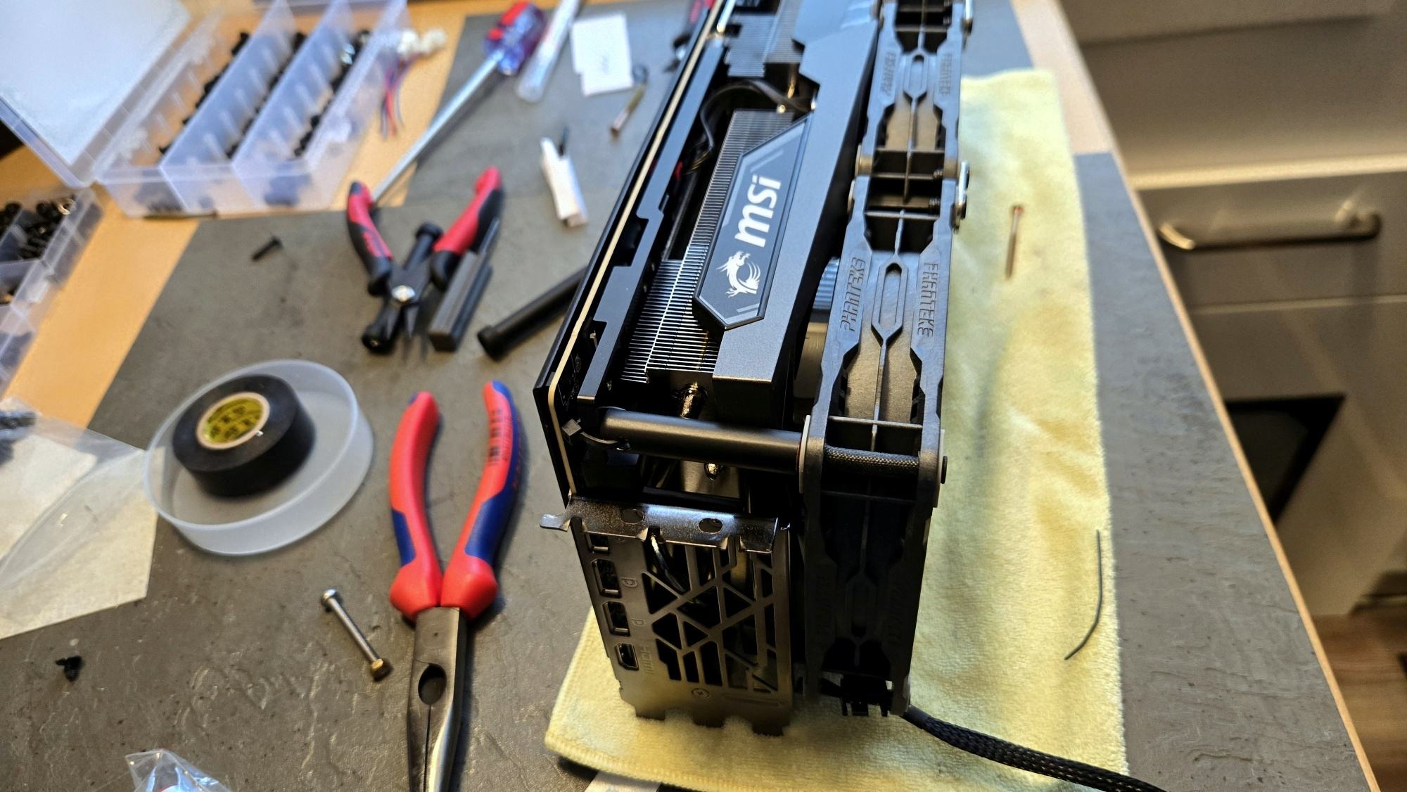 Da ich inzwischen im Weihnachtsurlaub bin und entsprechend Zeit habe, wollte ich die Gelegenheit nutzen und den T30 eine Chance geben. Hatte auch lange überlegt, welche Variante ich letztendlich umsetze, aber irgendwo wollte ich auch kein zusätzliches Geld ausgeben, weil Lüfter, Adapterkabel und jede Menge Material in der Werkstatt vorhanden war. Bei der MSI Gaming X Trio ist der Kühlkörper leider nicht ganz so ideal für einen Umbau geeignet, weil auf dem Kühlkörper hervorstehende Haken für die Kabelführung vorhanden sind.