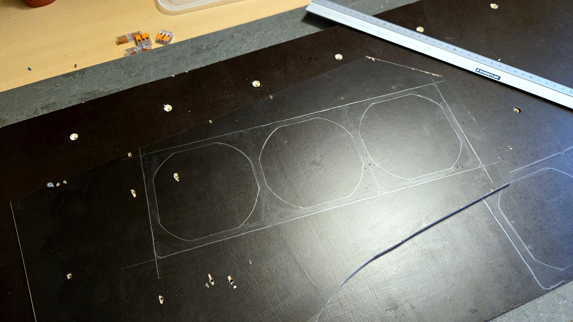 Daher war meine erste Idee eine Siebdurckplatte zu nehmen und auf der Unterseite bei den Haken die entsprechenden Stellen freizufräßen.
