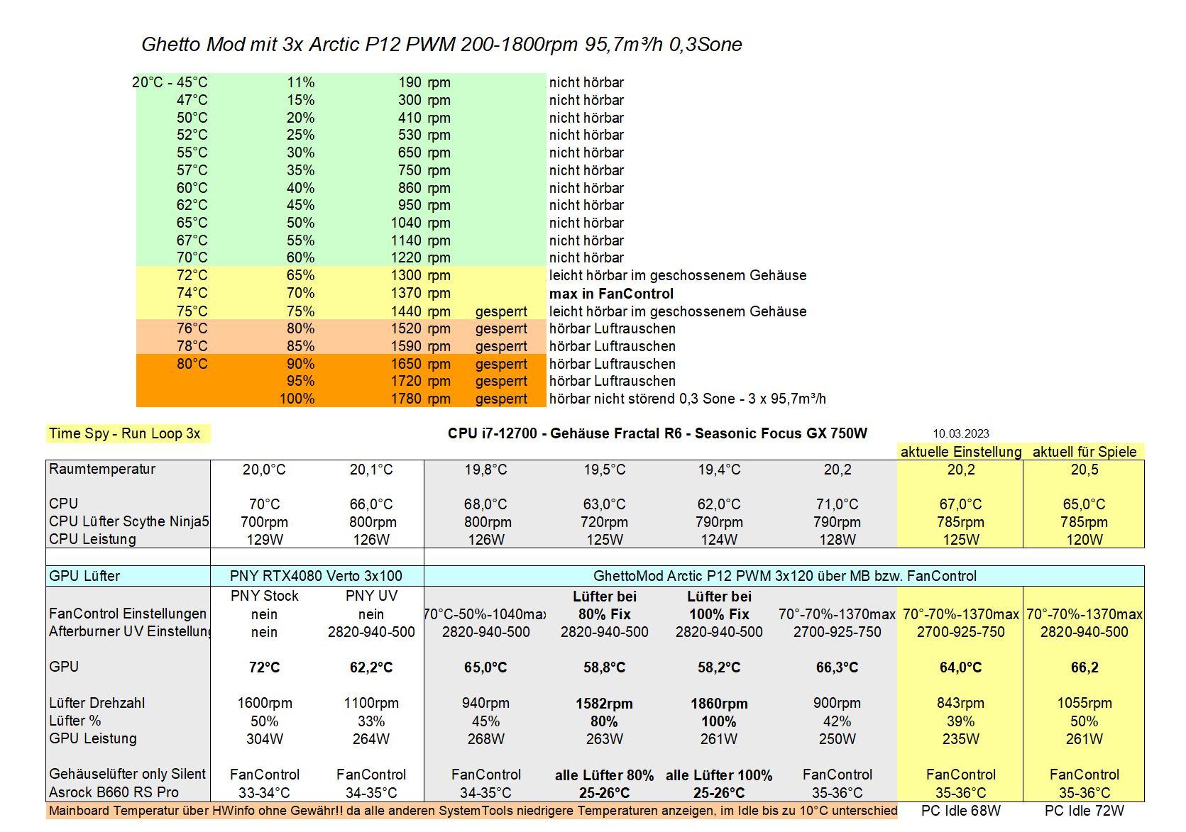 Die neuen Arctic P12 PMW Lüfter sind bis 1220rpm ( 60% ), in diesem Gehäuse nicht raus zu hören und werden nun über das MB bzw. FanControl gesteuert, das Klappt wunderbar.
