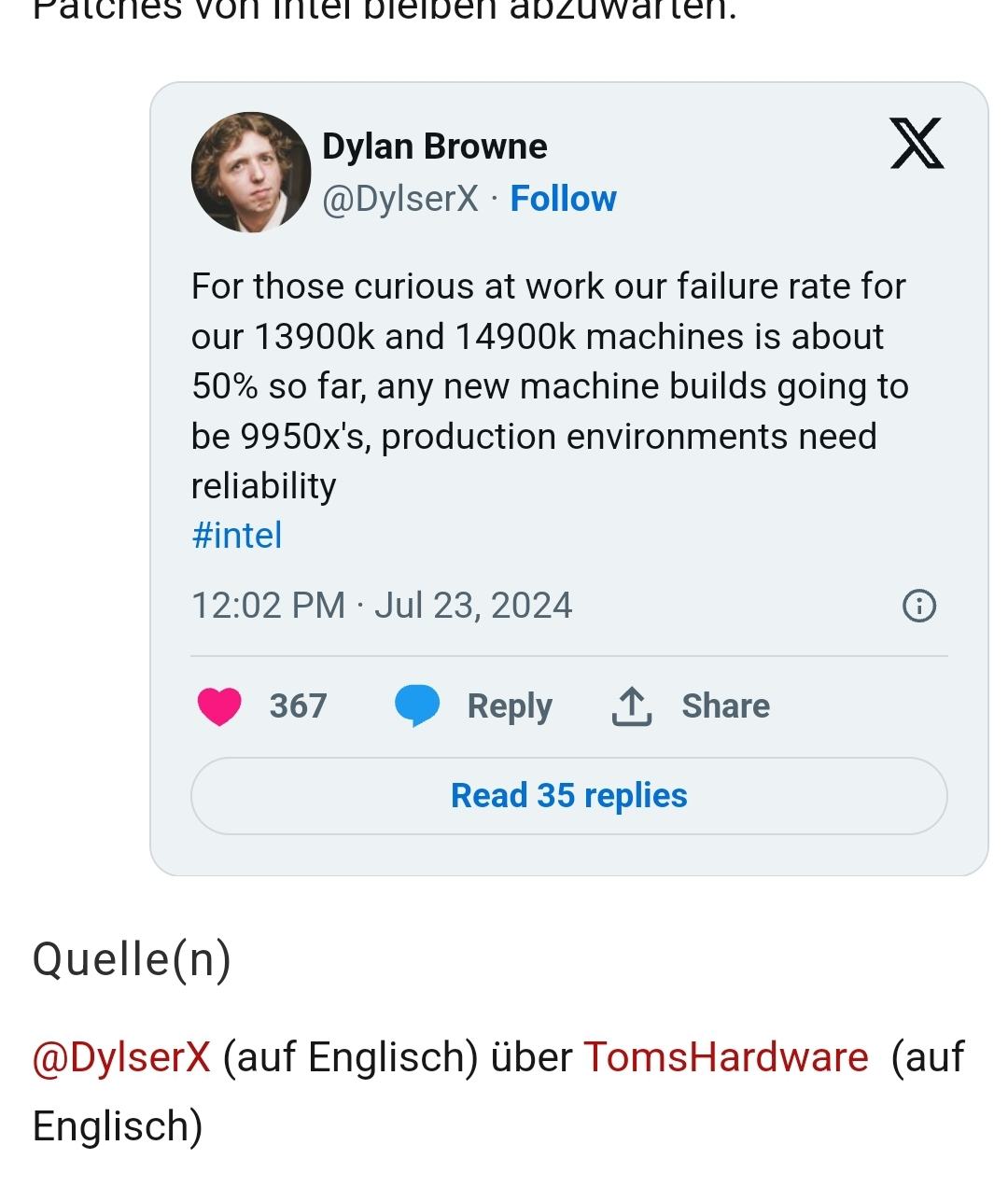 Wenn ich die Position vertrete das Board ist Mist und die Powerstages sind überlastet meckert der eine, wenn ich vertrete das Bios und die Powersettings sind Mist meckert der Zweite, wenn ich vertrete Dell hat ne Wareneingangsprüfung gemacht, festgestellt die Chips dürfen nicht hoch takten sonst zerstören sie sich selbst meckert der Dritte. Und wenn ich was anderes Vertrete meckert der Vierte.
