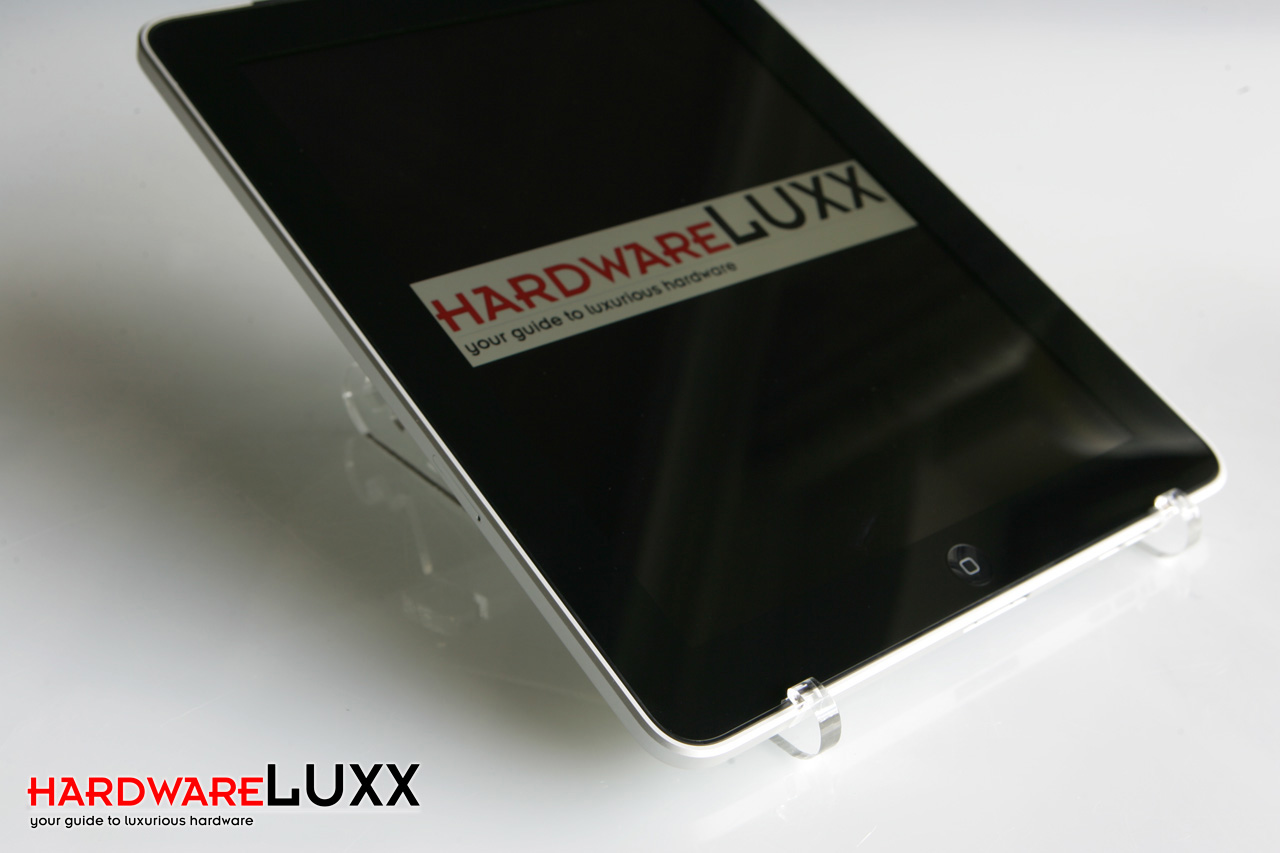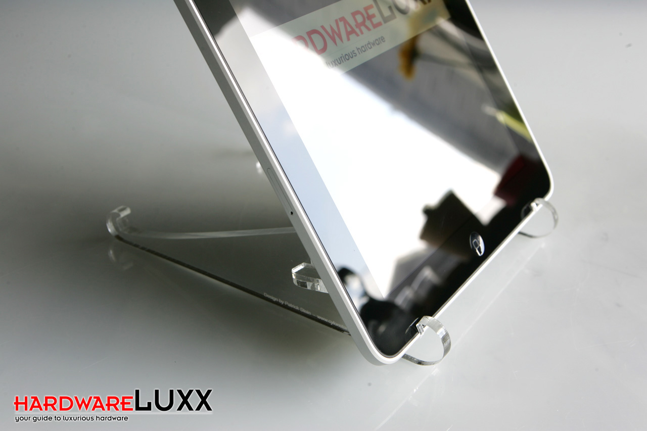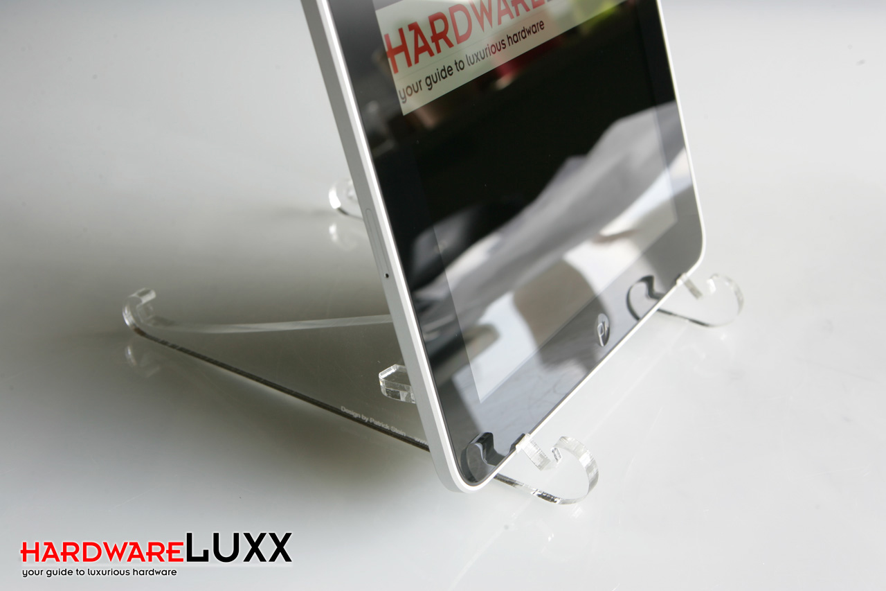 Den flachsten Winkel erreicht man durch die Ablage des iPads auf den langen Seiten der zwei Füße. Damit sind auch alle drei Winkel-Einstellungen abgehandelt. Zusammen mit der Möglichkeit das iPad im Querformat abzulegen, ergeben sich die maximal sechs Positionen auf dem Cylonstand.
