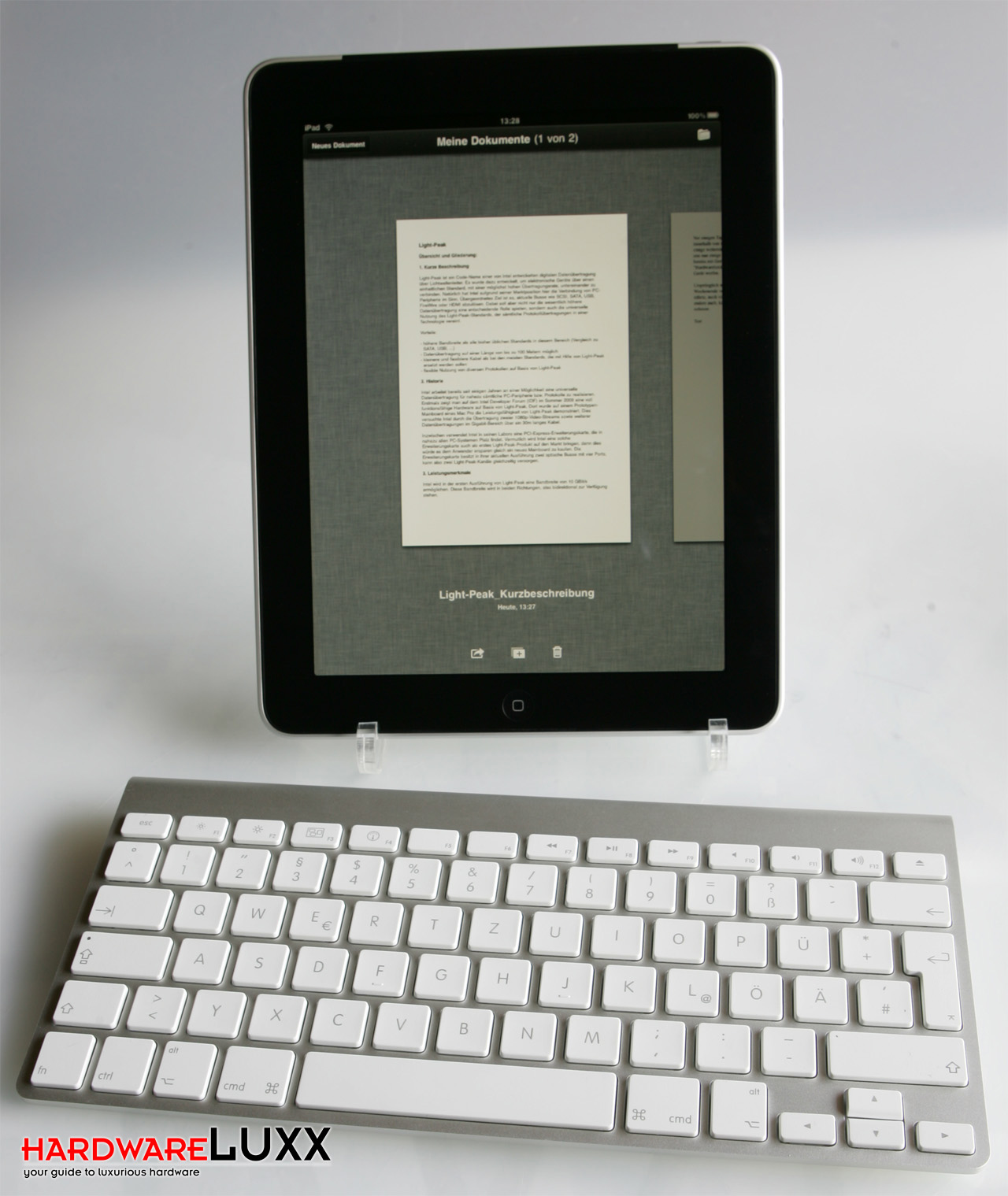 Um die Einsatzgebiete des Cylonstand einmal etwas näher zu erläutern, haben wir zwei mögliche Situationen nachgestellt. Hier zu sehen ist die Verwendung des iPads zusammen mit dem Wireless Keyboard, welches über Bluetooth angebunden wird. Über die drei möglichen Winkel lässt sich die ideale Arbeitsposition finden und auch einmal ein etwas längerer Text verfassen.