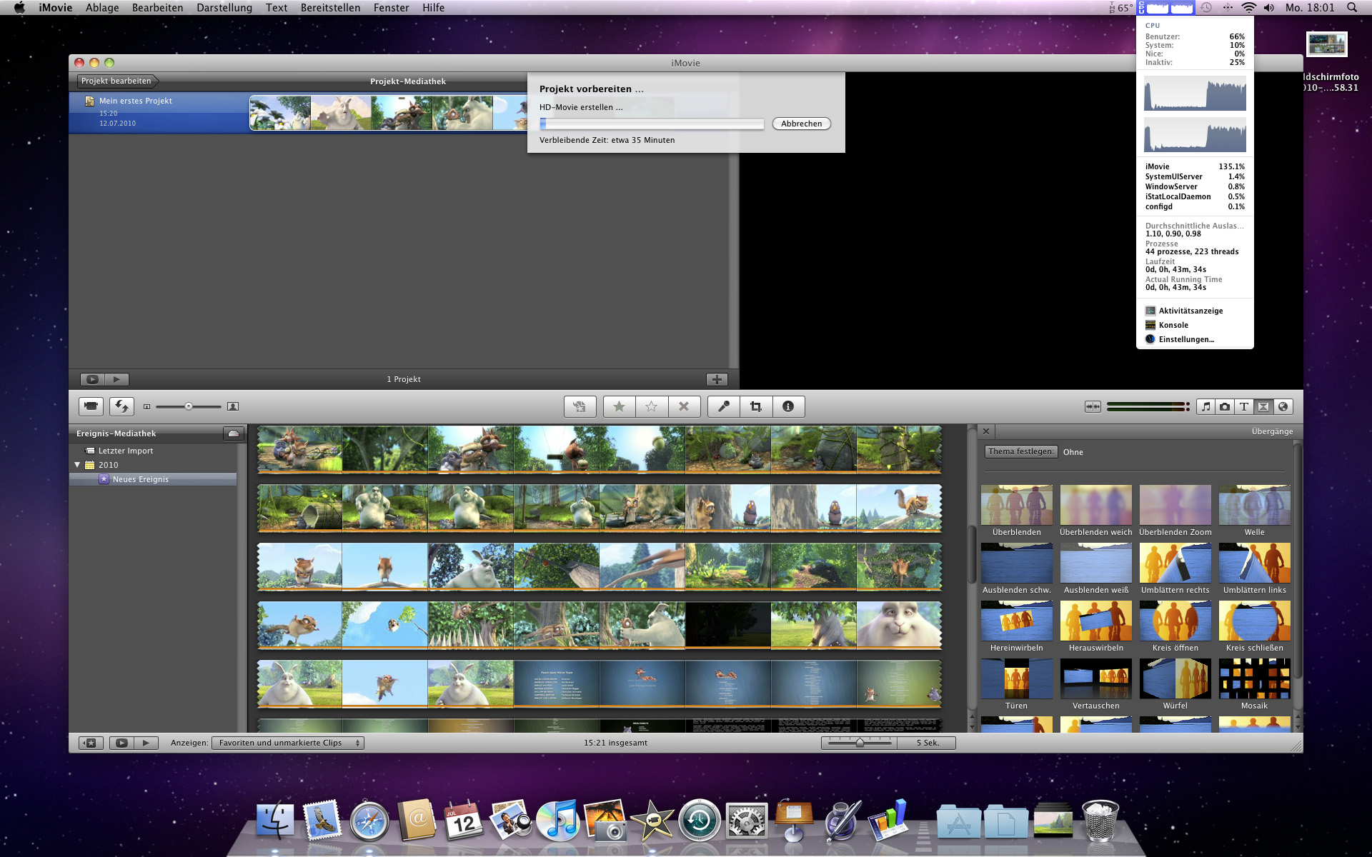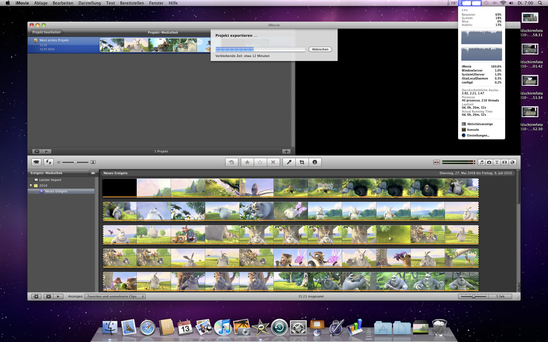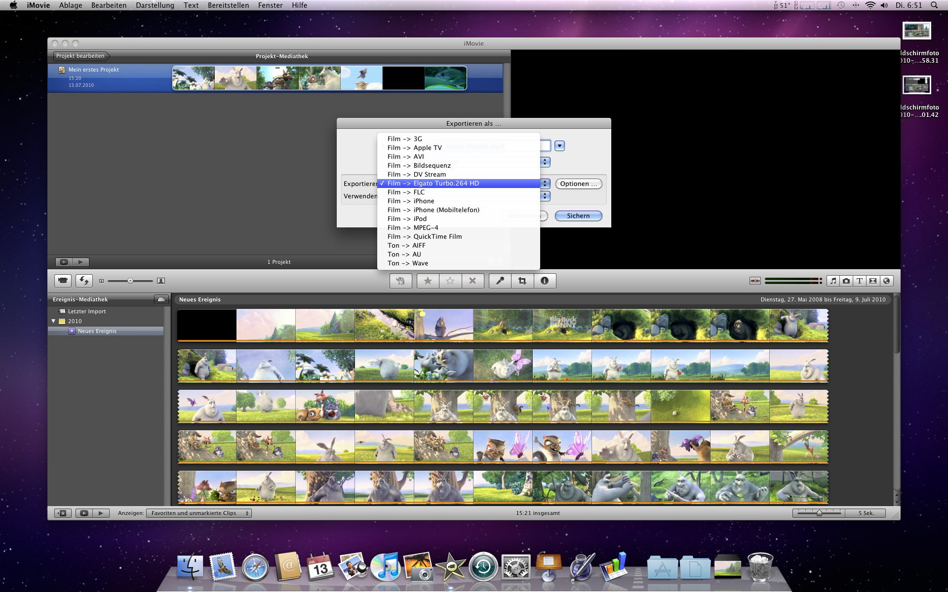 Doch nicht nur die eigene Software greift auf den Turbo.264 HD zu. Auch iMovie 09 kann Gebrauch von der Hardware machen und soll somit den Export beschleunigen. Wir haben uns einmal einen freien 1080p-Film (Big Buck Bunny) im avi-Format und zwei Kurzfilme in 4K-Auflösung geschnappt und diese in iMovie bearbeitet.