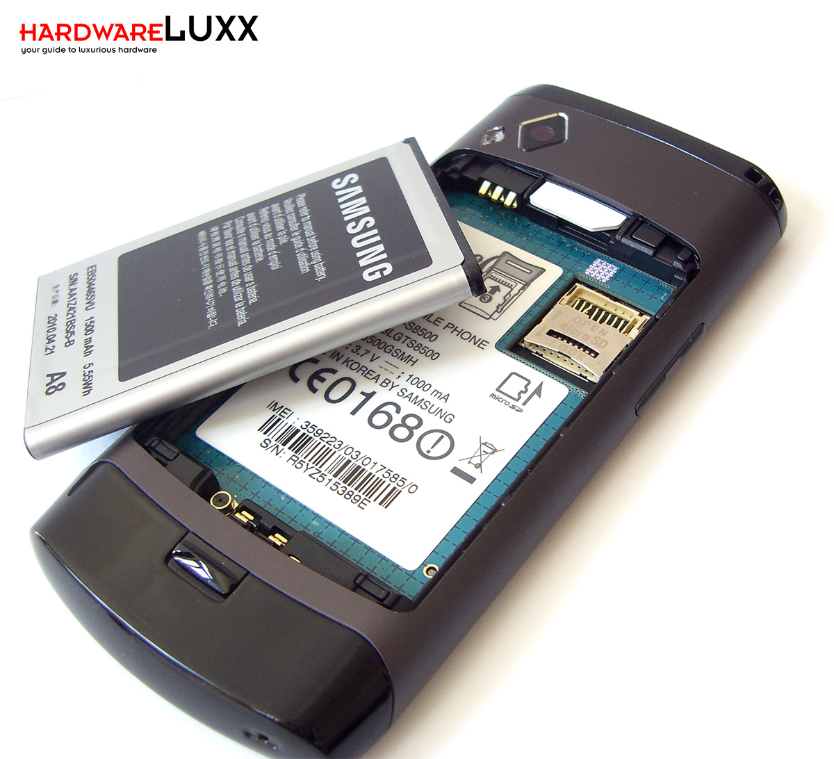 Unter der Klappe versteckt sich ein 1500 mAh starker Akku, der das Handy laut Hersteller im UMTS-Modus auf bis zu 550 Stunden Standby- sowie 420 Minuten Telefonzeit bringen soll. Hier findet sich auch der Einschub für die SIM-Karte in Normalgröße sowie der Steckplatz für die microSD-Karte, die bis zu 32 GB groß sein darf. Etwas bedauerlich ist der Fakt, dass zur Entnahme der Karte zunächst der Akku entnommen werden muss. Eine von außen zugängliche Karte wäre hier wünschenswert gewesen. Ebenfalls im Mobiltelefon verstaut: GPS, WLAN, Bluetooth 3.0 und die Mobilfunkstandards hoch bis HSPA.