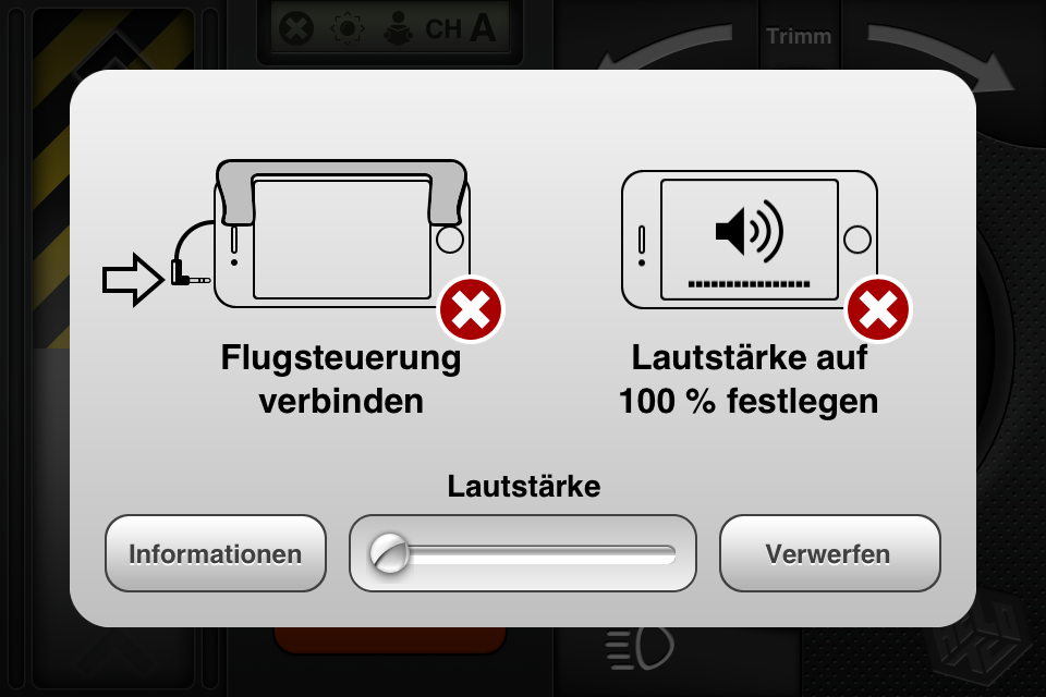 Die kostenlose App zum Helo TC kann im App Store bezogen werden (iTunes-Link). Nach dem Start der App weist sie den Benutzer darauf hin, dass die Lautstärke auf das Maximum gestellt werden sollte, um die Übertragung über die Audio-Schnittstelle sicher zu gewährleisten. Zusätzlich sollte der Flugmodus aktiviert werden, um Störungen zu verhindern.