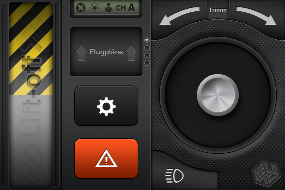 Mittig in rot zu sehen ist sozusagen der Notaus. Er schaltet den Helo TC komplett ab. Rechts daneben bzw. unterhalb des Sticks können die LEDs am Helo TC ein- bzw. ausgeschaltet werden. Bis zu vier Flugmanöver mit einer Länge von einer Minute lassen sich aufzeichnen und immer wieder abrufen. Dazu dienst die Schaltfläche "Flugpläne". Auf die Einstellungen gehen wir gesondert ein.
