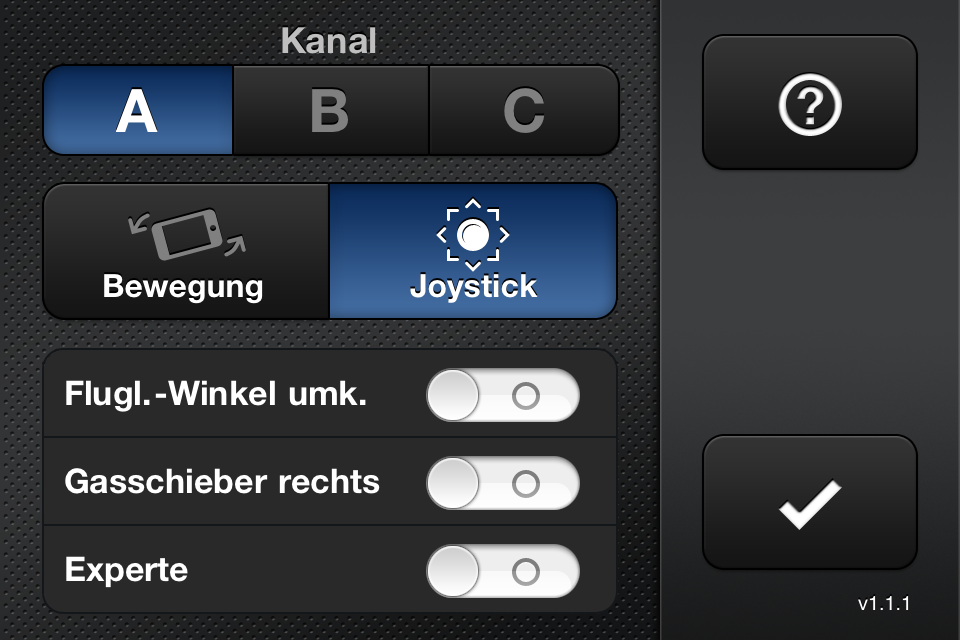 In den Einstellungen kann ein Infrarot-Kanal ausgewählt werden, falls es zu Störungen mit anderen Infrarot-Quellen kommt. Des Weiteren kann auch über den Gyro-Sensor des iOS-Geräts gesteuert werden. Weitere Einstellungen für Links- oder Rechtshänder sind ebenfalls vorhanden. Über den Experten-Modus lässt sich die Drehzahl des Rotors erhöhen, was größere Höhen und extremere Manöver zulässt.