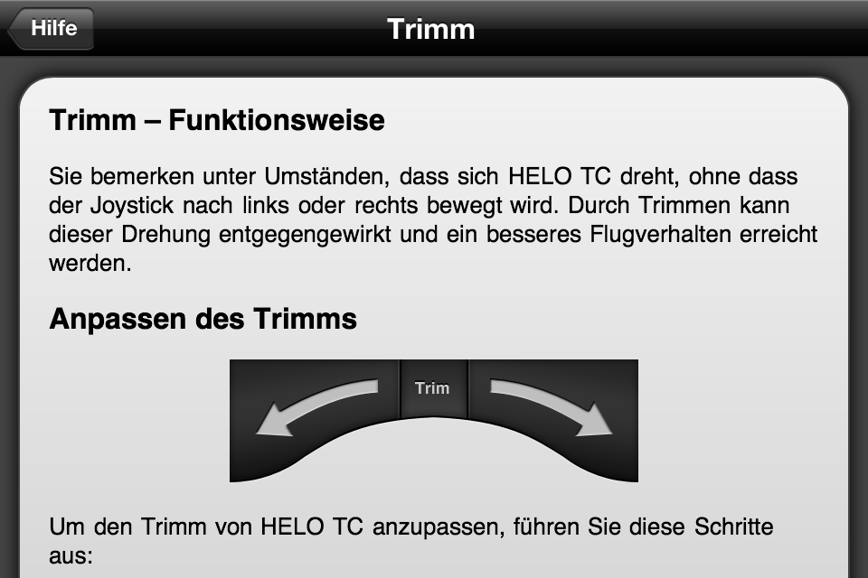 In der Hilfe werden die wichtigsten Fragen beantwortet. Erklärt werden nicht nur die Inbetriebnahme, sondern auch die Optionen sowie Steuerung des Helo TC an sich.