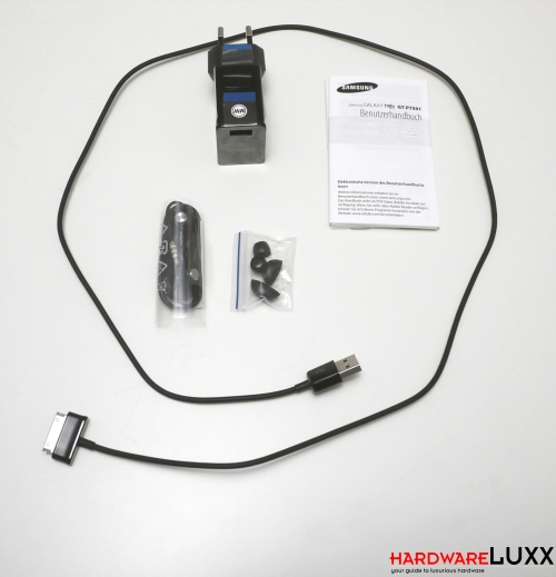 Das beiliegende Zubehör ist überschaubar - aber das ist bei den meisten Tablets der Fall. Neben einer Kurzanleitung liefert Samsung das USB/Stromkabel sowie das eigentliche Netzteil mit. Zusätzlich gibt es noch ein Stereoheadset.