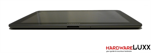 Die Schnittstellenausstattung beschränkt sich auf das Wesentlichste. An der Unterseite kann ein Kabel angeschlossen werden, das am anderen Ende einen USB-Stecker bietet. Um das Tablet mit Strom zu versorgen, wird das beiliegende Netzteil an diesen USB-Stecker angeschlossen. Auf der rechten Seites des kombinierten USB/Netzkabelanschlusses hat das Mikrofon seinen Platz gefunden.