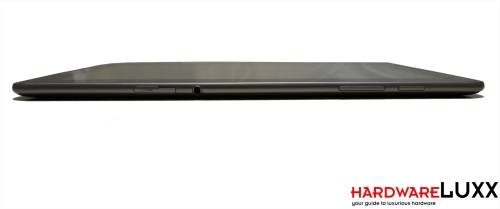 Der zweite Anschluss des Samsung-Tablets ist ein Kopfhörerausgang im 3,5-mm-Klinkenformat. Neben diesem Anschluss sind auch die beiden Bedienschalter des Tablets - der An/Aus-Schalter und eine Lautstärkewippe - sowie der Einschub für die SIM-Karte auf der oberen Kante des Tablets zu finden. Die Bedienschalter fallen flach aus, lassen sich aber trotzdem präzise betätigen.