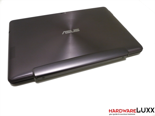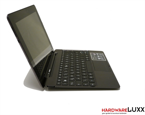 Gleiches gilt für den seitlichen Blick. Im Praxiseinsatz fällt allerdings auf, dass die Gewichtsverteilung etwas ungünstiger als bei einem normalen Note- oder Netbook ist. Der Tabletteil ist relativ schwer, der Verbund kann dementsprechend bei unvorsichtiger Handhabung leicht nach hinten kippen.