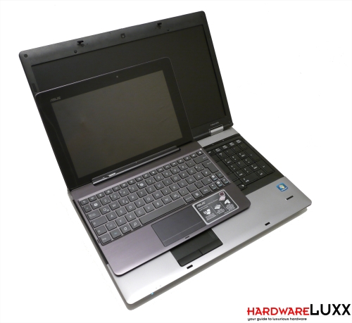 Um den Größenunterschied zwischen Transformer Prime und einem typischen Notebook zu veranschaulichen, haben wir das ASUS-Tablet gemeinsam mit einem normalen 15,6-Zoll-Notebook fotografiert. Deutlich wird sowohl der Unterschied bei der Tastatur- als auch bei der Bildschirmfläche.
