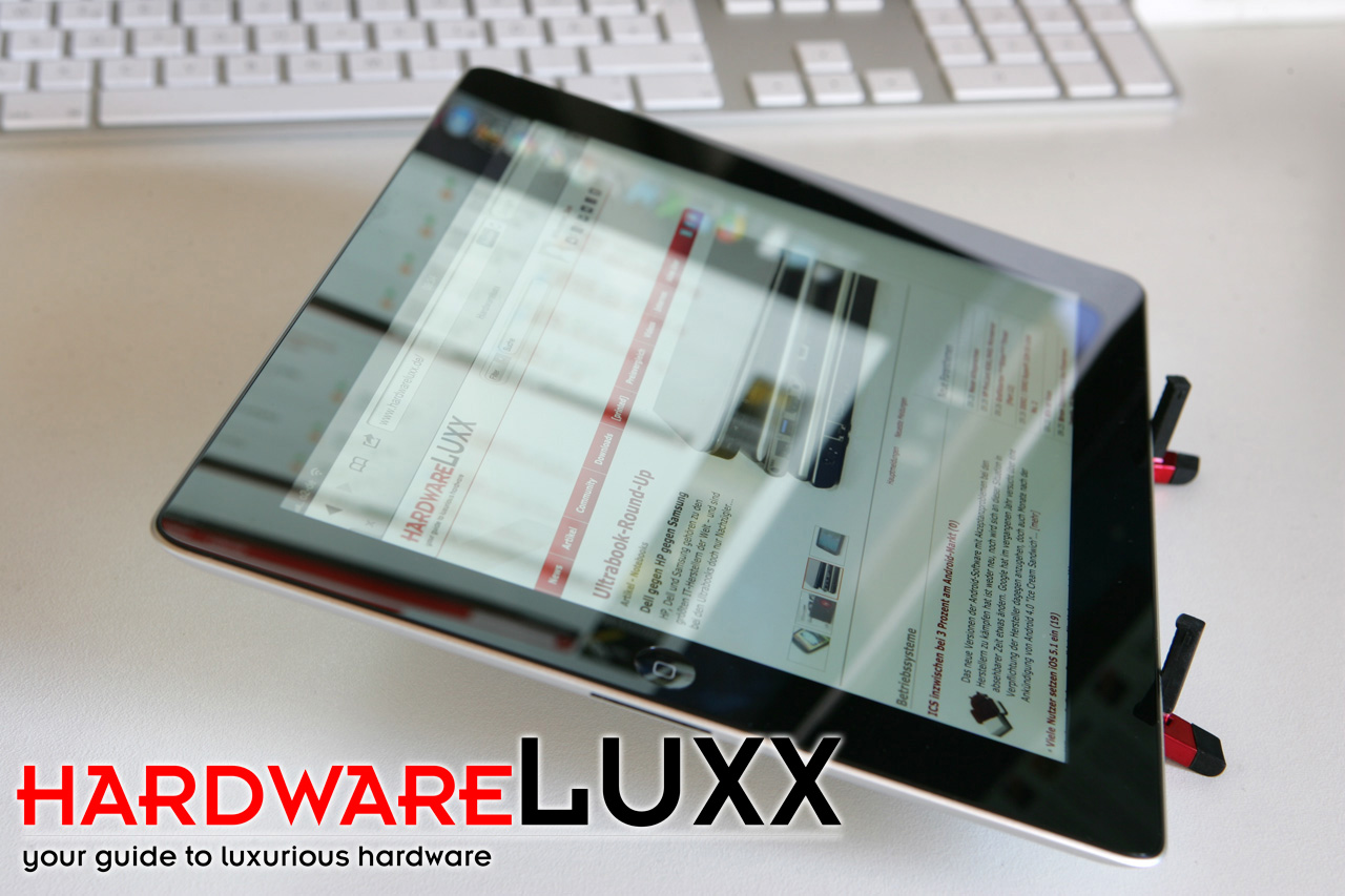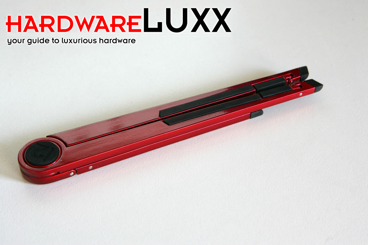 Die Problematik, den richtigen Winkel für das iPad in den beiden Ausrichtungen zu finden, haben wir bereits angesprochen. Neben dem BookBook-Case als eigentliche Hülle bietet Twelvesouth auch noch den Compass an. Dabei handelt es sich um einen kompakten Tablet-Stand aus Aluminium. In obigen Bildern ist er bereits im Einsatz zu sehen und auch die Funktionsweise wird schnell ersichtlich.