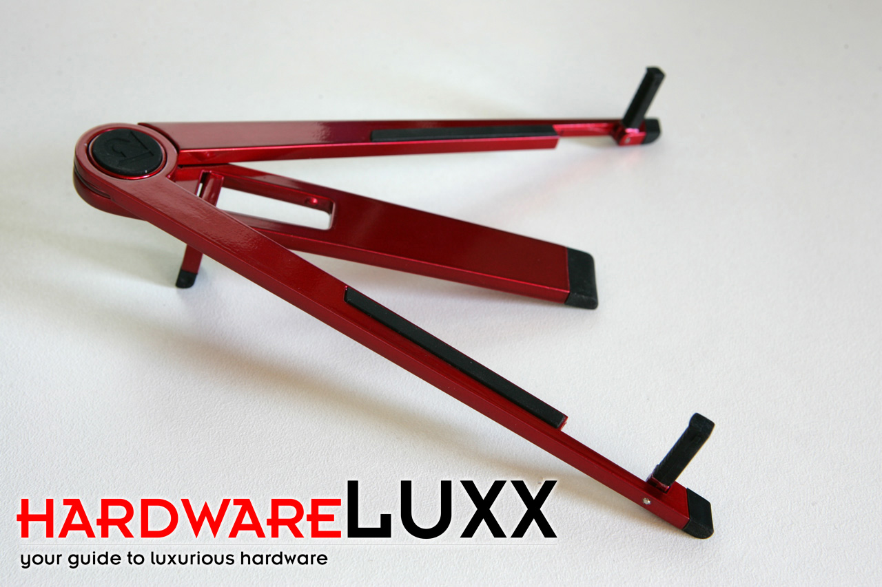 Erst bei der alleinigen Betrachtung wird der Aufbau des Compass deutlich. Auf den zwei dünnen Armen wird das iPad abgelegt. Sie dienen auch als Stütze für den zentralen Fuß. Dieser bietet in seiner flachen Ausprägung einen kleinen Zusatzfuß für den flachen Winkel. Hoch aufgestellt steht der Compass dann auf drei Beinen, aber dennoch sicher. Über Gummierungen wird der Stand selbst, aber auch das iPad (kratz)sicher gehalten.