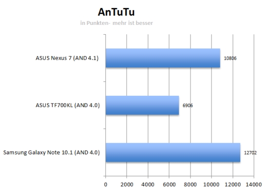 Besser sehen die Ergebnisse von AnTuTu aus. Der Abstand zum Note 10.1 ist überschaubar, dass TF700KL wird geradezu deklassiert. Allerdings schwächelt der Qualcomm-Prozessor im Infinity in diesem Benchmark auch besonders. AnTuTu straft ab, dass er nur über zwei Kerne verfügt. Der Tegra 3-Prozessor des Nexus 7 zeigt sich mit seinen vier Kernen hingegen von seiner starken Seite.