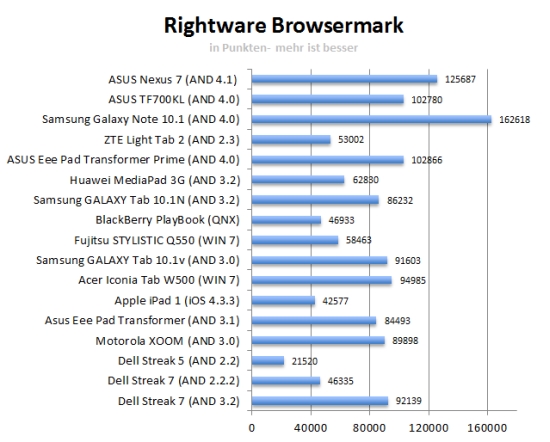 Der Browsermark-Test wurde ebenfalls per WLAN durchgeführt. Auch in diesem Benchmark schlägt sich das Google-Tablet wacker. Nur Samsungs Galaxy Note 10.1 mit seinem Exynos-Prozessor kann sich noch vor das kleine 7-Zoll-Gerät setzen.