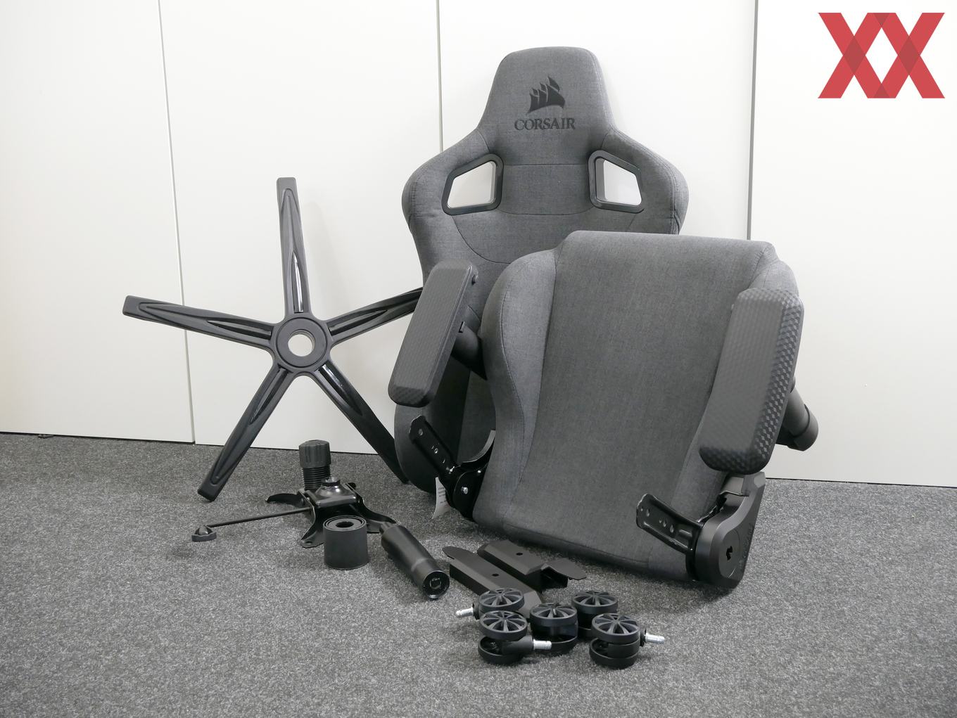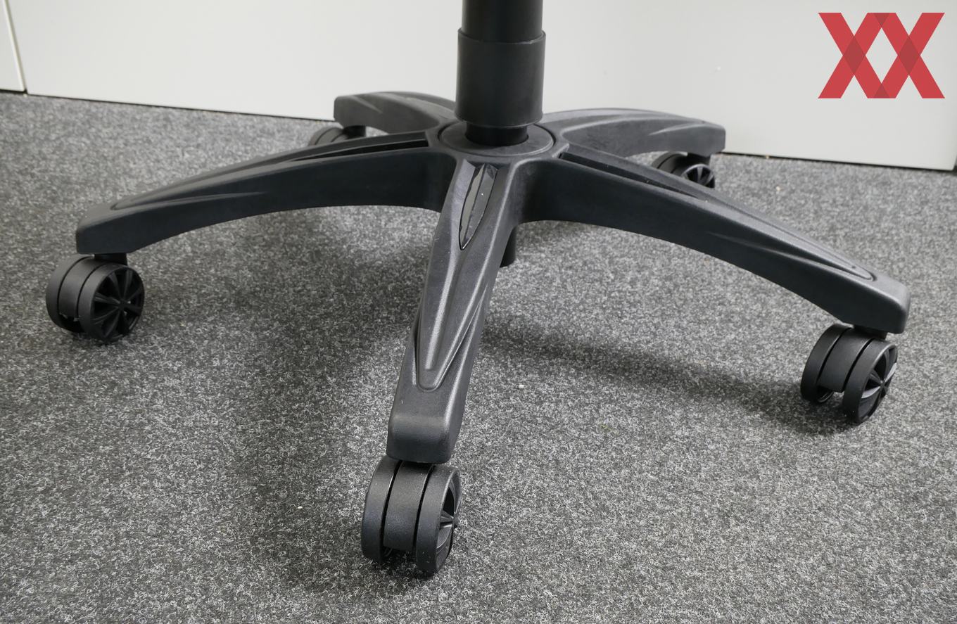 Keine große Überraschung ist es, dass das Drehkreuz in die dezente Linie passt. Es ist aus Kunststoff gefertigt und hinterlässt einen hochwertigen Eindruck. Einen Unterschied zum T1 Race gibt es bei den Rollen. Während Corsair bei seinem Erstlingswerk auf Inline-Skate-Rollen aus Nylon setzt, kommt der T3 mit normalen Bürostuhlrollen zum Käufer. Auf unserem Nadelfilz-Boden kam es zu keinen Problemen.