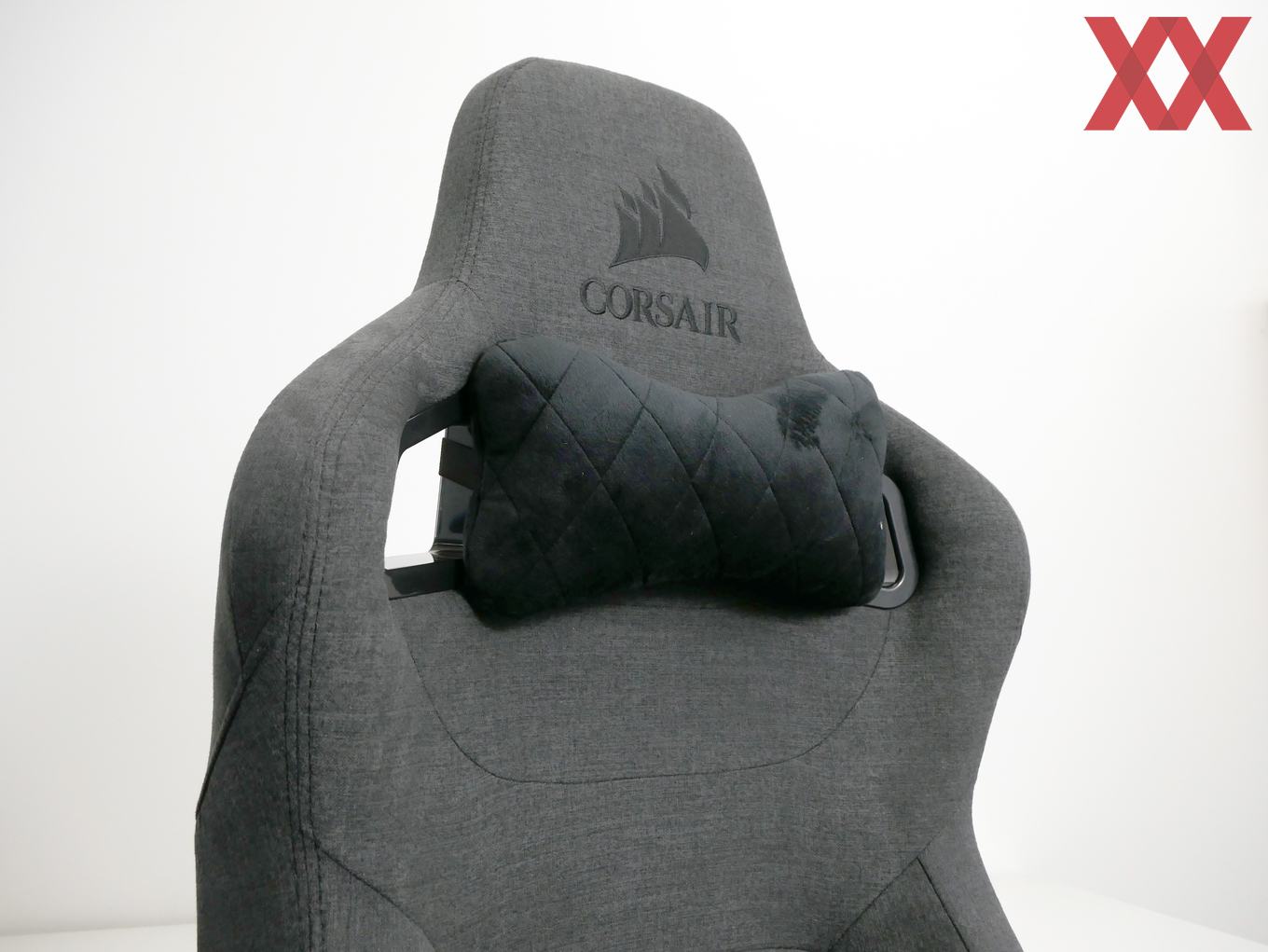 Auch die Rückseite des Stuhls fällt entsprechend vergleichsweise schlicht aus, denn auch hier wird großflächig das Mikrofaser-Gewebe genutzt. Einzig das Corsair-Logo ist auf beiden Seiten in Schwarz aufgestickt, was die Optik weiter unterstützt. So passt der Stuhl nicht nur problemlos ins "Spielezimmer", sondern macht auch in jedem Büro eine gute Figur.