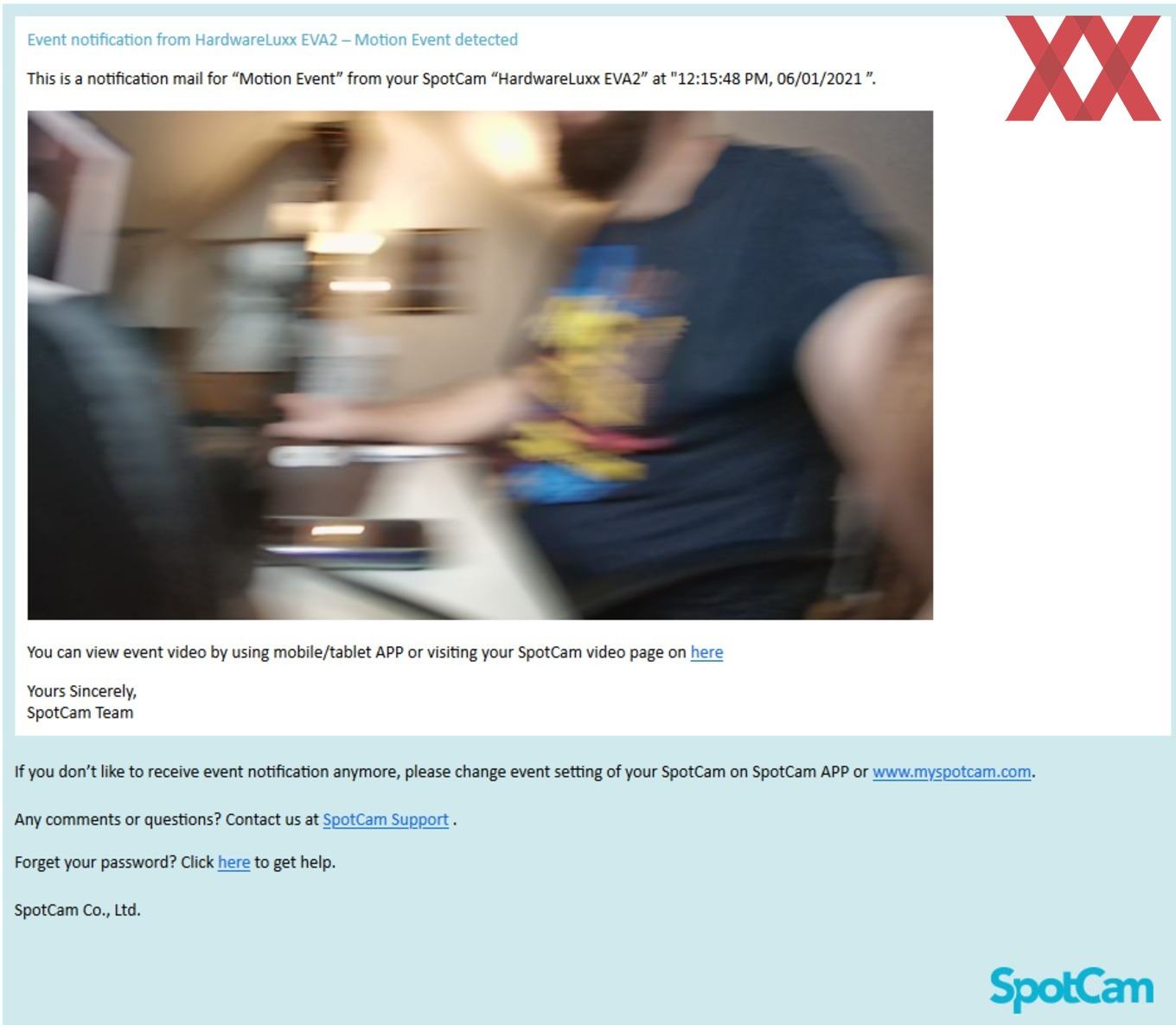 Die so entstandenen Alarme können auf verschiedene Art und Weise benutzt werden. In der Wiedergabe per Browser oder App werden sie wie schon bei der SpotCam HD als Markierungen in der Zeitleiste angezeigt. Interessanter sind vermutlich jedoch Benachrichtigungen, die per E-Mail mit Hinweisbild an den Nutzer verschickt werden. Wie aussagekräftig dieses ist, hängt natürlich von den individuellen Gegebenheiten und Einstellungen ab. Erfreulicherweise funktioniert die Benachrichtigung innerhalb weniger Sekunden.