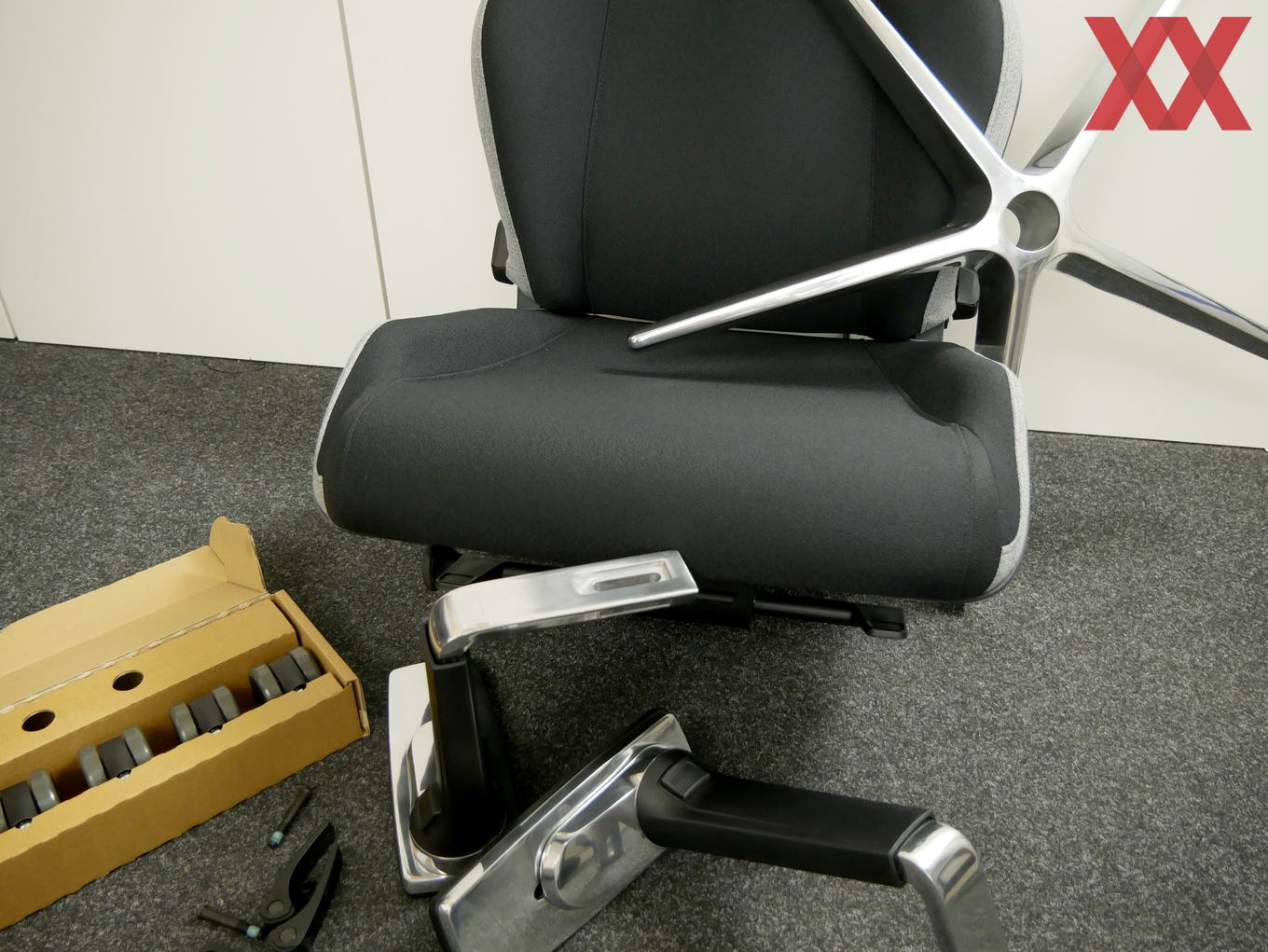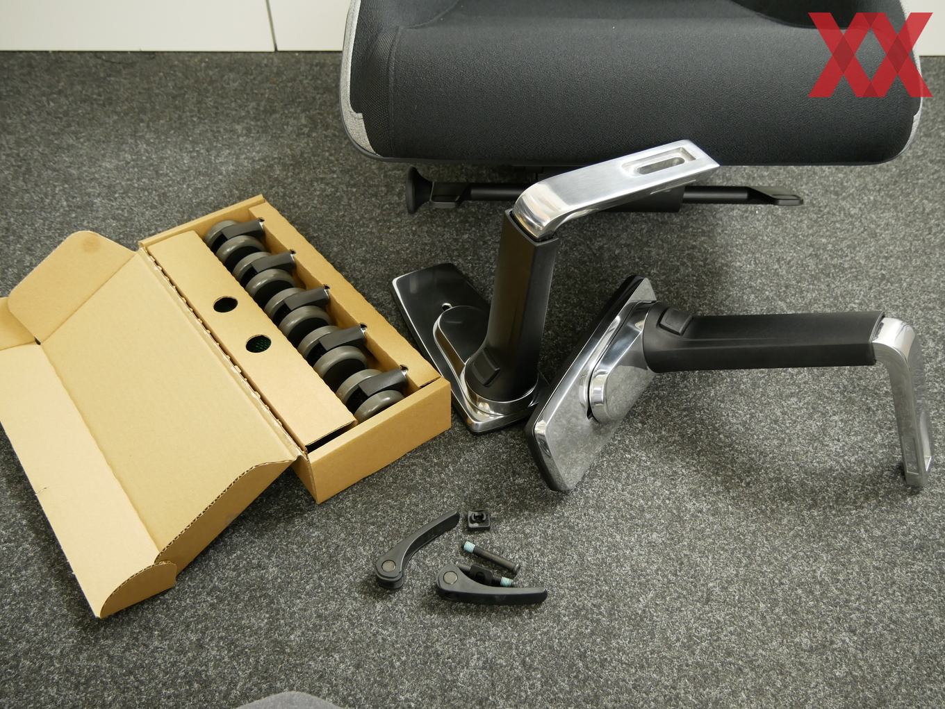 Recaros Gaming-Chair ist ein High-End-Produkt durch und durch. Das Merkt man dem Stuhl bereits beim Zusammenbau an, der schnell und ohne den Einsatz von zusätzlichem Werkzeug auskommt. Insbesondere stechen die Stützen der Armlehnen und das Fußkreuz und poliertem Aluminium hervor, die sich noch dazu bestens in das Design einfügen.