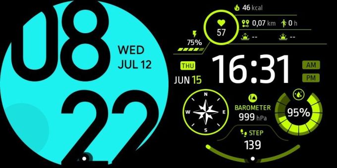 Für das AMOLED-Display stehen ganz unterschiedlich gestaltete Watchfaces zur Auswahl. Das Standard-Watchface (rechts im Bild) zeigt eine breite Auswahl an Daten an, wirkt dadurch aber auch etwas überladen. Alternativ gibt es auch deutlich reduziertere Designs. Eine Reihe von Ziffernblättern kann direkt über die Smartwatch aufgerufen werden. Zusätzliche Ziffernblätter stellt Mobvoi über die Mobvoi Health-App bereit. Darunter sind allerdings auch etliche zahlungspflichtige Watchfaces.