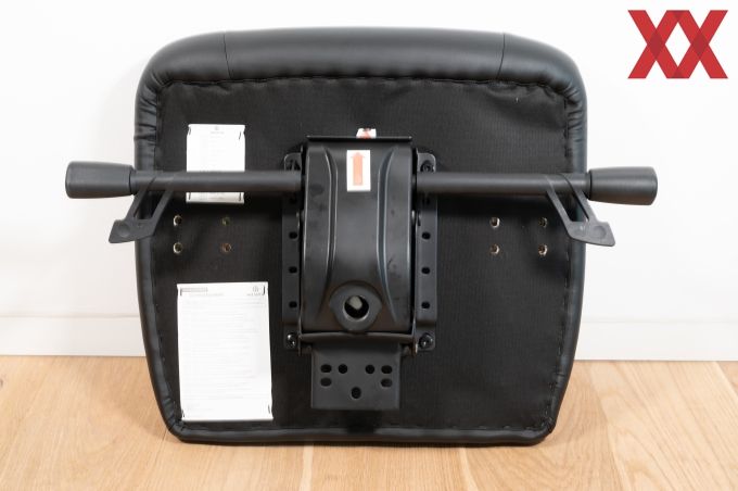 Im nächsten Schritt wird dann die Sitzfläche mit der Mechanik verbunden, dafür wird die Mechanik einfach in der, mit Pfeilen markierten Position auf die Unterseite der Sitzfläche gelegt und dann mit den entsprechenden Schrauben fixiert. Anschließend können dann die zwei separaten Teile für die linke und die rechte Armlehne mit der Sitzfläche verschraubt werden. Durch die, in das Material bereits eingesetzten Gewinde, können die Schrauben sehr einfach mit dem beiliegenden Montagewerkzeug eingeschraubt und festgezogen werden, jedoch geht es mit ordentlichem Werkzeug natürlich noch einmal einfacher und schneller.