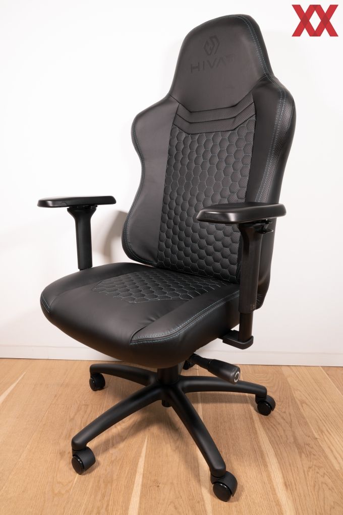 Die Stühle der Firma Hivar sehen bis auf eine Modellreihe alle recht identisch aus und unterscheiden sich eigentlich nur in der Farbe und ggf. der Musterung auf Rückenlehne und Sitzfläche. Lediglich die Eqlipse-Serie setzt sich mit einem anderen Kopfkissen und abweichenden Design der Rückenlehne etwas ab. Das Design Der Orbical-Reihe besteht dabei aus einer sehr großen Anzahl an Sechsecken, die als zusammenhängendes Muster in den mittleren Bereich der Rückenlehne eingestickt wurden. Das Muster erstreckt sich ebenfalls auf einen Teil der Sitzfläche. Eingerahmt wird das Muster dann durch glatte Bereiche, sowohl auf der Sitzfläche als auch an der Rückenlehne. Zusätzlich befindet sich auf der Rückenlehne auch noch ein kleiner Teil mit gelochtem Kunstleder.