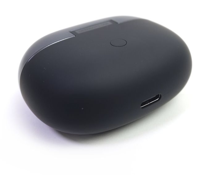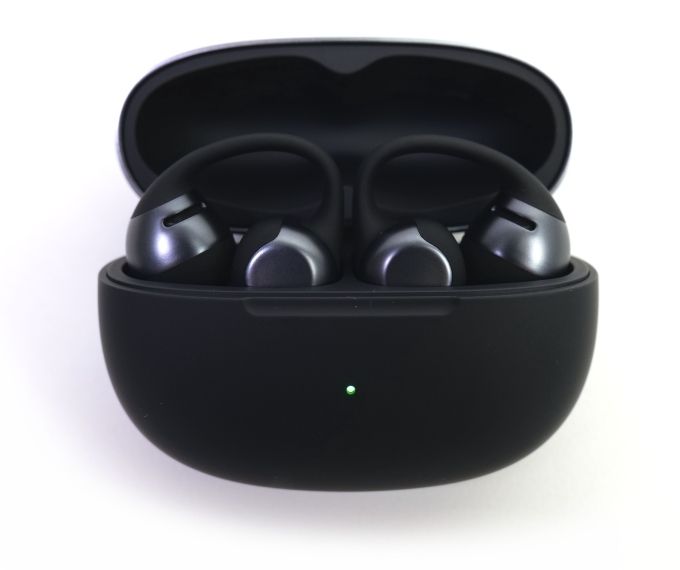 Eine mehrfarbige Status-LED kann an der Oberseite der Ladeschale aufleuchten. Der glänzende Teil lässt sich einfach aufklappen, so dass die eigentlichen Ohrhörer zum Vorschein kommen.