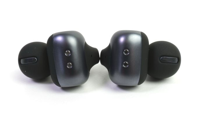 Diese Ohrhörer zeigen sich wie die Ladeschale in einem Mix aus matt-schwarzen und grau-glänzenden Elementen. Matt-schwarz sind konkret die Flächen, die Körperkontakt haben und deshalb mit weichem Silikon beschichtet wurden. Die Ohrhörer gliedern sich praktisch in drei Teile: Den annähernd kugelförmigen Lautsprecherteil, das zylinderförmige Batteriemodul und ein Verbindungselement. Das besteht aus einer ummantelten Titanlegierung, die dünn und flexibel gestaltet wurde. Shokz spricht dabei von der JointArc-Technologie.