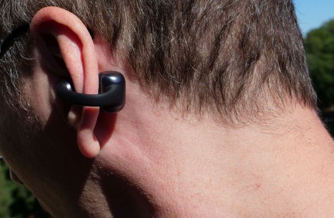 Man klemmt sich das Batteriemodul der Clip-On-Ohrhörer hinter das Ohr und steckt den Lautsprecherteil ins Ohr - eine Platzierung, die in unserer Wahrnehmung intuitiver ist als die Bügellösung bei den OpenFit-Modellen. Deren Bügellösung sorgt zwar für einen noch festeren Halt. Für uns haben aber auch die OpenDots ONE allemal einen guten Halt und sitzen sicherer als typische In-Ears. Gleichzeitig empfinden wir das Tragegefühl als angenehm. Zum Brillenbügel bleibt einiger Abstand, so dass es mit der Kombination aus Brille und Ohrhörer keinerlei Probleme gibt. Im Gegensatz zu In-Ears steckt der Lautsprecherteil der OpenDots ONE nicht fest im Ohr, sondern sitzt locker etwas neben dem Gehörgang. Dadurch bleibt die Umgebungswahrnehmung bei nicht zu hoher Wiedergabelautstärke erhalten.