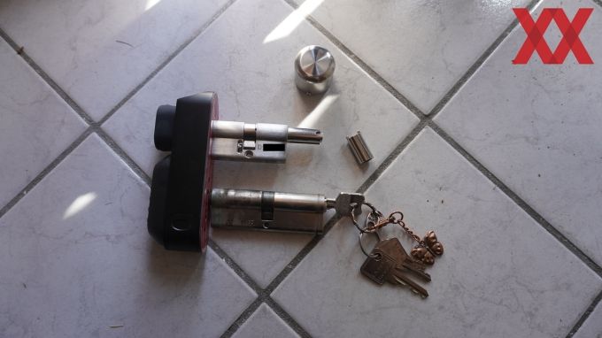 Sobald alles passt und sich schließen lässt, wird der Drehknopf von innen montiert, der Zylinder mit der Querschraube arretiert und schon ist das Gerät einsatzbereit. Damit der Zylinder innen nicht heraussteht, lässt sich der Drehknopf in verschiedenen Positionen aufstecken.