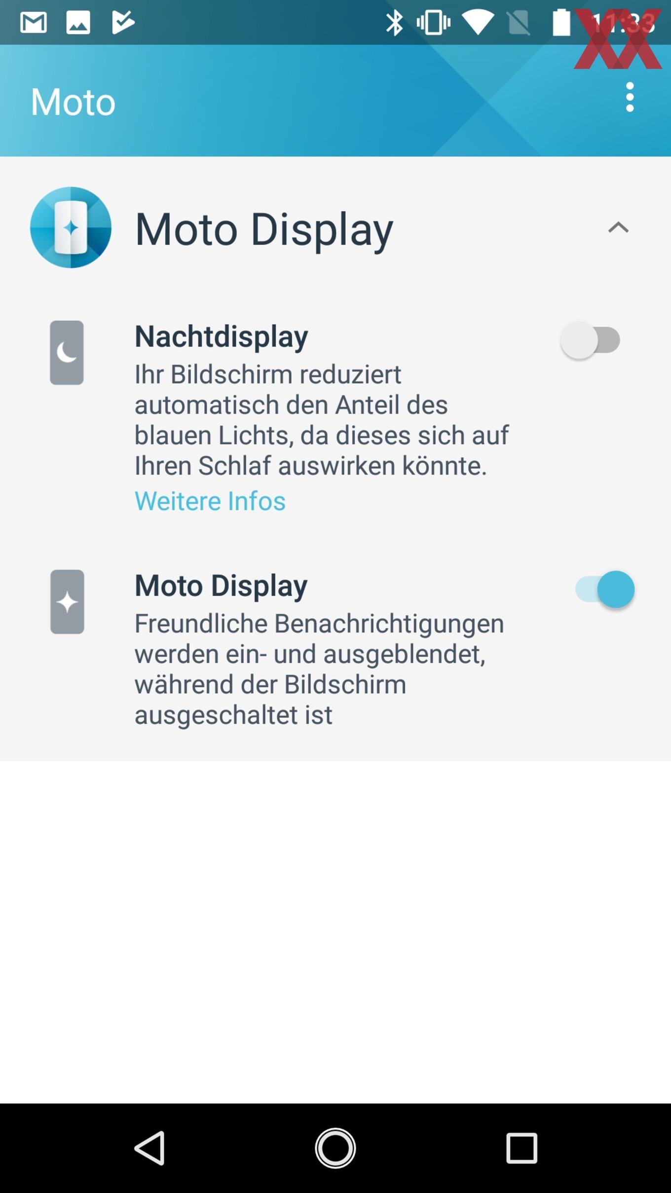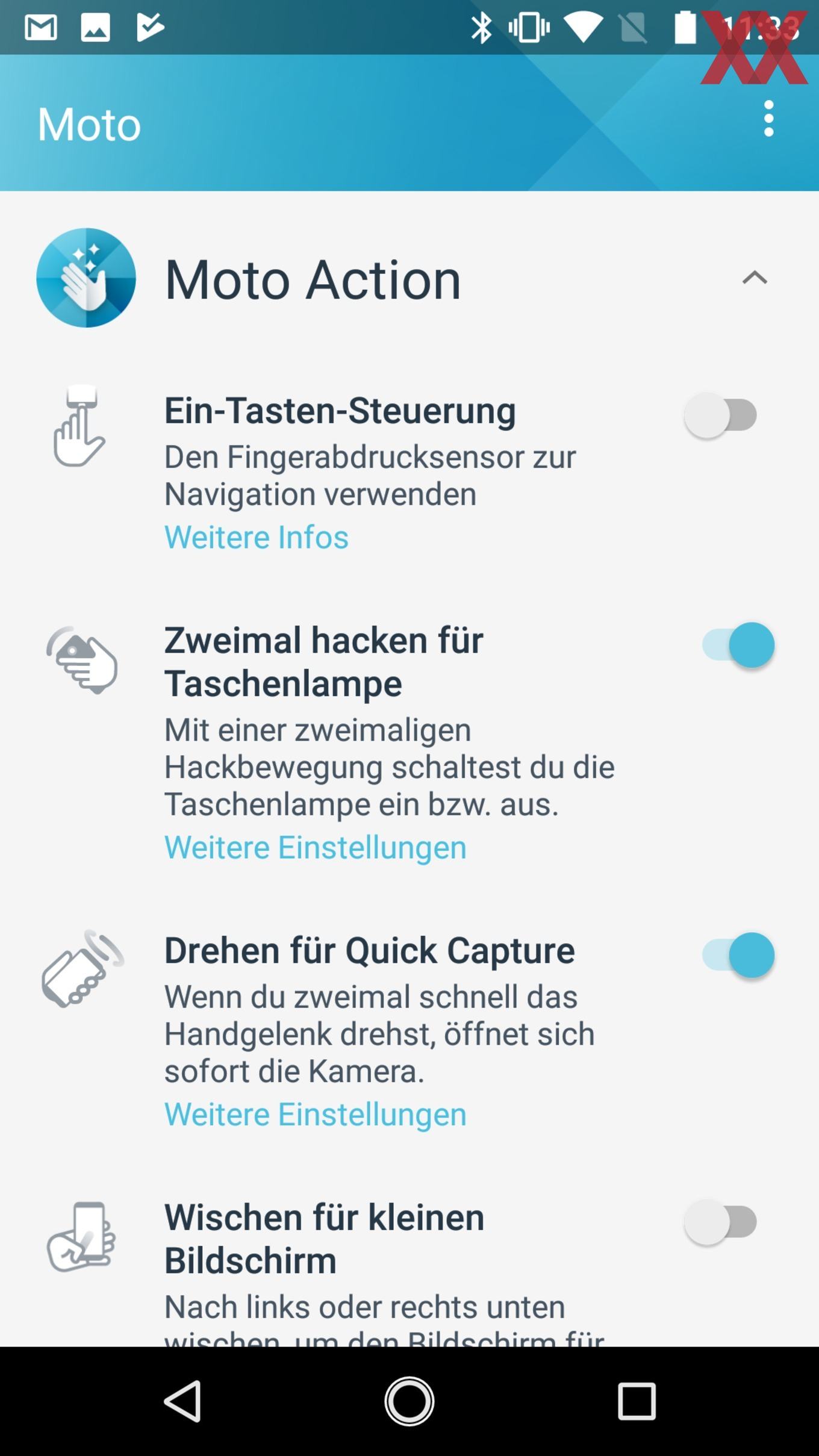 Denn auch wenn auf eine eigene Oberfläche verzichtet wird: Eigene Software kommt auf dem Moto G5S dennoch zum Einsatz. So wird die Kamera über die Moto-Kamera-App gesteuert, für eine einfachere Bedienung vertraut man auf Moto. Hinter letzterem verbergen sich Moto Action und Moto Display und damit unter anderem die Möglichkeit, bestimmte Gesten und Tastenkombinationen für Befehle zu nutzen. So kann mit einem zweimaligen schnellen Drehen des Smartphones die Kamera-App gestartet werden, eine doppelte „Hack"-Bewegung aktiviert die Taschenlampen-Funktion. Ebenso lässt sich der Fingerabdrucksensor als Alternative für die drei Android-Tasten ein- und ausschalten. Für das Ein- und Ausblenden der Benachrichtigungszentrale lässt sich der Sensor aber leider ebenso wenig einsetzen wie für die Navigation innerhalb der Galerie. Lediglich das Aktivieren und Deaktivieren des Standbys ist noch möglich.