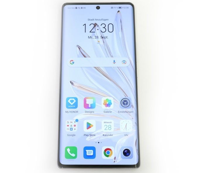 Das 6,67 Zoll große OLED-Display bietet viel Displayfläche und nutzt den den vorhandenen Platz gut aus. Zu den Rändern hin wölbt sich das Display deutlich. Das ist Geschmackssache, sorgt in Kombination mit der ebenfalls gebogenen Rückseite aber für einen symmetrischen Aufbau. Dadurch wiederum liegt das Honor 70 gut in der Hand. Das kontraststarke Display nutzt die FHD+-Auflösung mit 2.400 x 1.080 Pixeln, das Seitenverhältnis liegt entsprechend bei 20:9. Bei Auslieferung klebt bereits eine Displayschutzfolie auf dem Display. Als Betriebssystem ist Android 12 mit Honors Magic UI vorinstalliert.