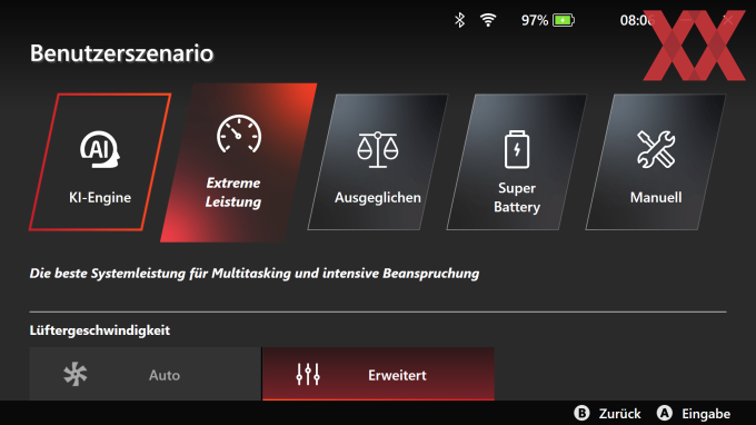 Aber selbst im "Manuell"-Profil ist es nicht möglich das Lüfterprofil zu ändern. Hier kann man immerhin die Power-Limits verändern. Dies ist im Bereich von 20 bis 40 W möglich, wenngleich in "Extreme Leistung" auch 45/43 W anliegen dürfen. MSI unterscheidet hier auch zwischen Wechselspannung (Betrieb im Netzteil) und Gleichspannung (Akkubetrieb). Verstanden wird dies aber sicherlich nicht von jedem Nutzer. Wieso nennt man diese Optionen nicht "Netzteil" und "Batterie" oder "Akku"?