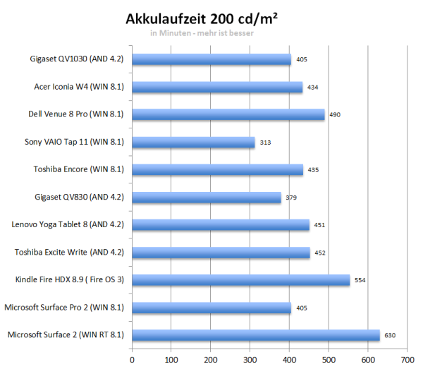 Angesichts des hochauflösenden Displays und des leistungsstarken SoCs ist besonders spannend, wie die Akkulaufzeit des QV1030 ausfällt. Der integrierte Lithium-Polymer-Akku ist mit stattlichen 9.000 mAh bei 3,7 Volt spezifiziert und verhilft dem Tablet selbst im Performance-Modus zu einer Laufzeit von immerhin 6 Stunden und 45 Minuten (Wiedergabe eines 1080p-Videos bei 200 cd/m²). Damit steht das QV1030 zwar etwas besser da als das kleine QV830, kommt aber doch nur auf eine etwas unterdurchschnittliche Laufzeit. Im Energiesparmodus ist es um die Laufzeit deutlich besser bestellt und es werden 8 Stunden und 37 Minuten mit einer Akkuladung überbrückt. Durch das Absenken der Leistung kann die Laufzeit also um bald zwei Stunden gesteigert werden.
