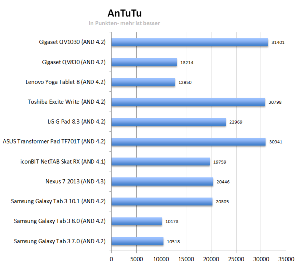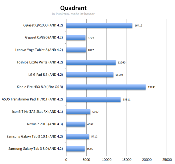 Noch deutlicher kann es sich in reinen Android-Benchmarks wie AnTuTu und Quadrant von einfacher ausgestatteten Konkurrenzmodellen absetzen. Der AnTuTu-Score liegt etwa gleichauf mit dem von anderen Tegra 4-Tablets (ASUS Transformer Pad TF701T und Toshiba Excite Write). Die Quadrant-Ergebnisse dieser drei Tablets zeigen hingegen eine etwas breitere Streuung. Insgesamt ist aber klar, dass Gigaset seinem Premium-Tablet leistungsstarke Hardware mit auf den Weg gegeben hat, die sich beispielsweise auch beim Spielen positiv bemerkbar macht.