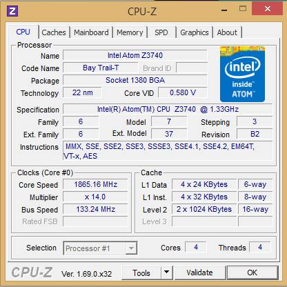 Intels Bay Trail-T-Plattform ist aktuell der Standard für günstige Windowstablets. Speziell der Atom Z3740 ist weit verbreitet und findet auch im VivoTab Note 8 Verwendung. Er kombiniert vier bis zu 1,83 GHz schnelle Silvermontkerne mit einer Intel HD Graphics (4 EUs, bis zu 688 MHz). Der Tabletprozessor kombiniert eine solide Performance mit einer niedrigen SDP (Scenario Design Power) von 2,2 Watt. Dadurch ist eine passive Kühlung möglich.